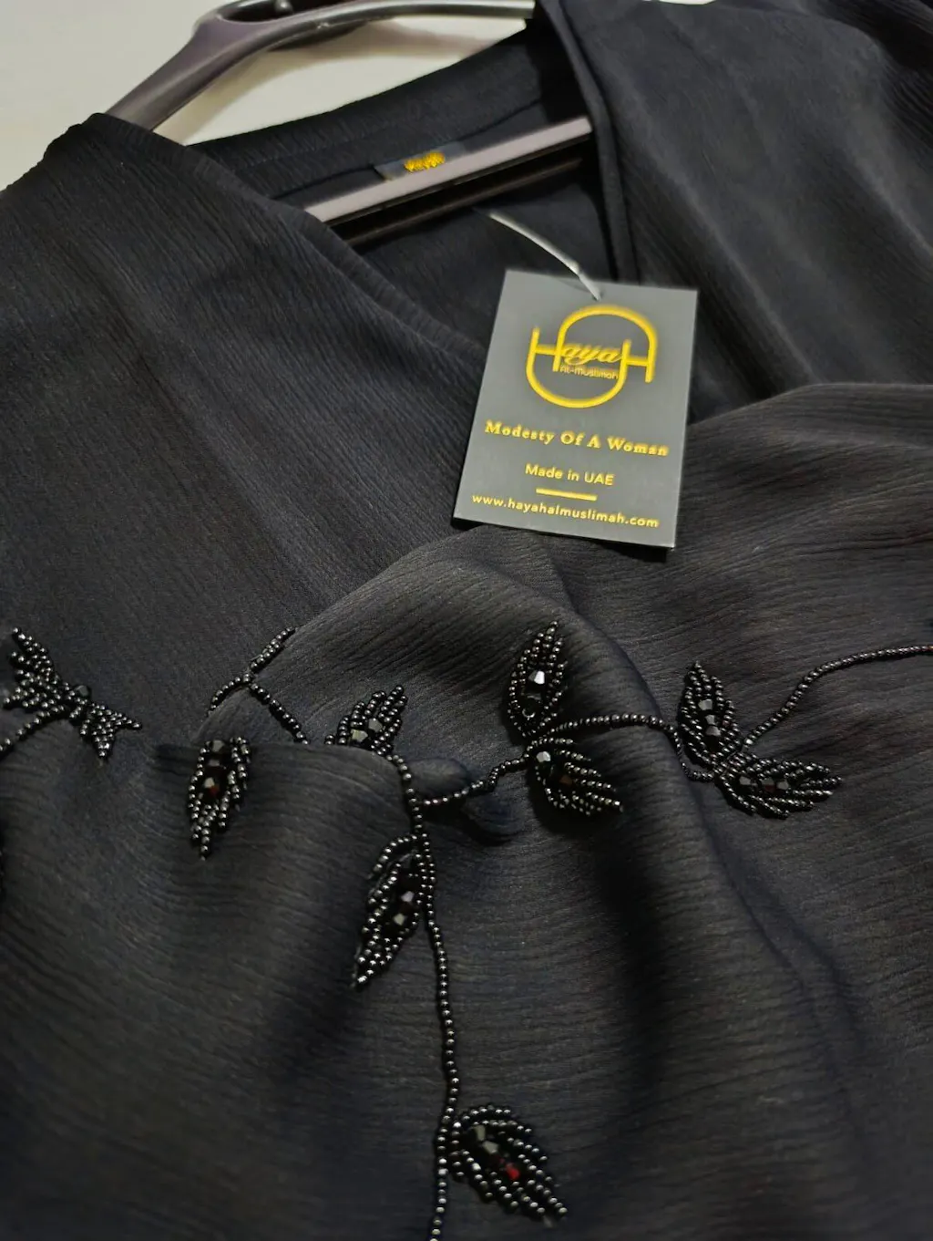 Cut in a fluid A-Line sillouhette featuring cuff sleeves. Styling details include hand stitched embellishments on the sleeves making this abaya perfect for an intimate occasion. Constructed with textured polyester & crepe fabric which uplifts every detail on this abaya. Style it with contrasting heels and an evening bag. Ideal for Ramadan, Eid, and casual wear