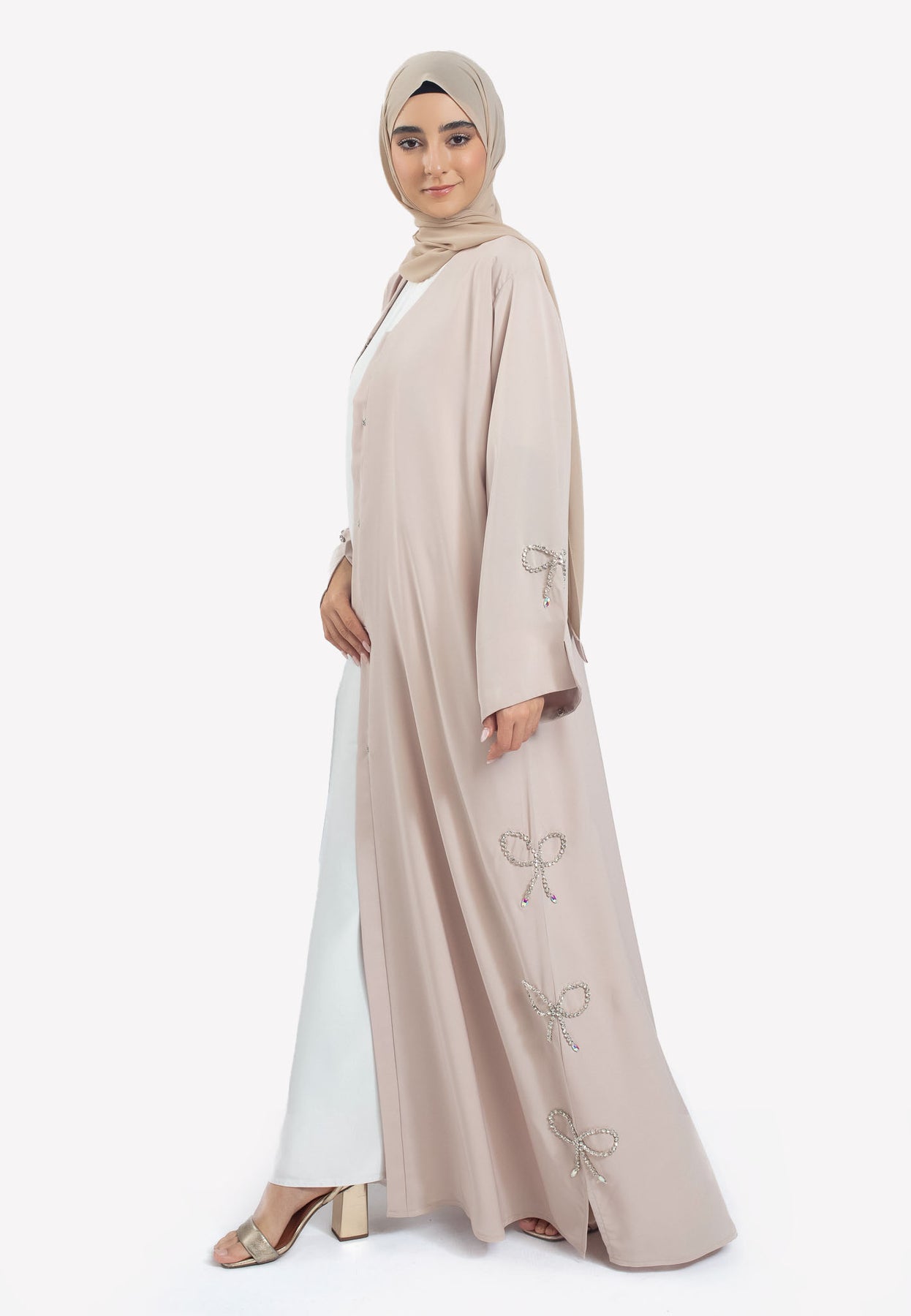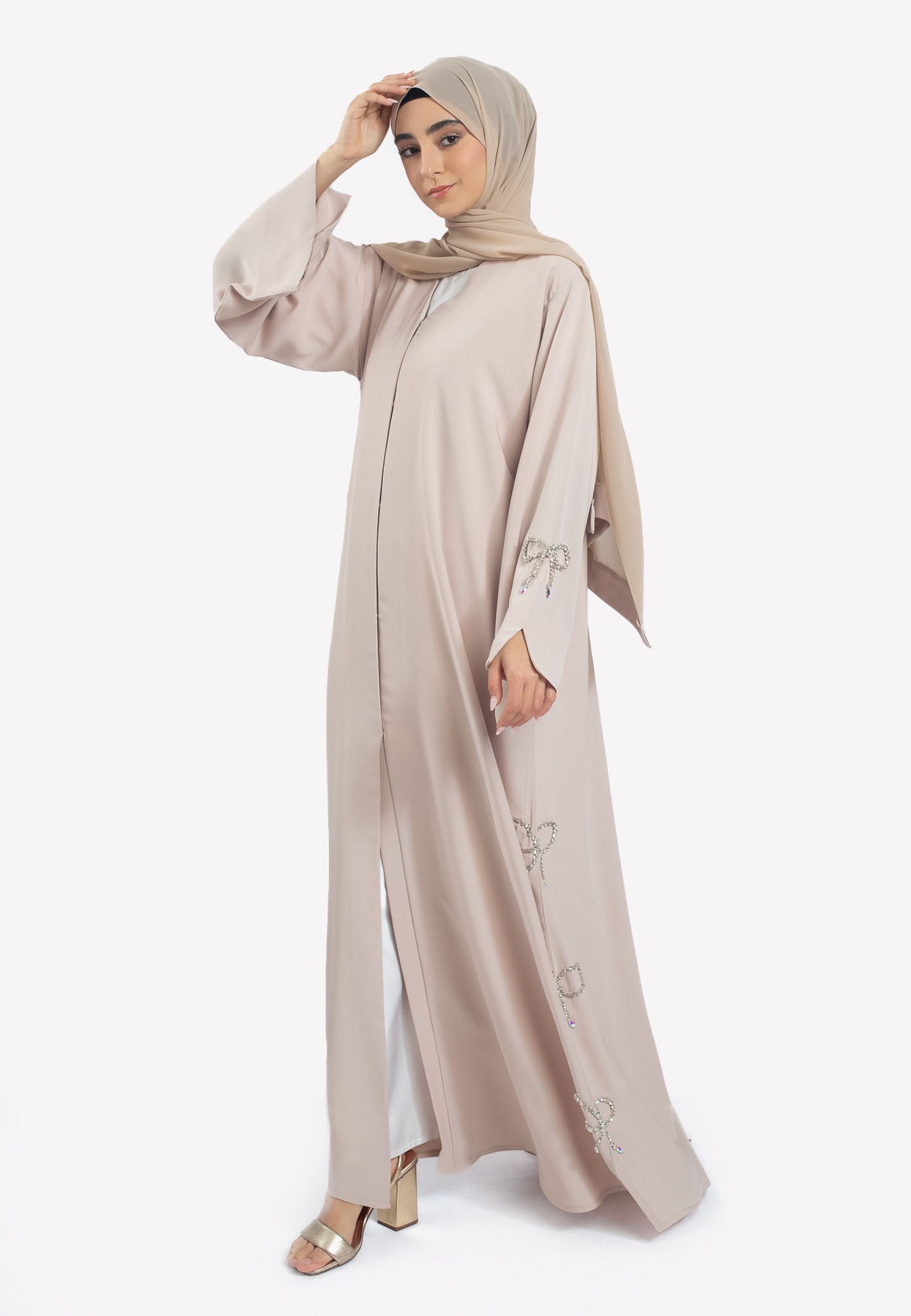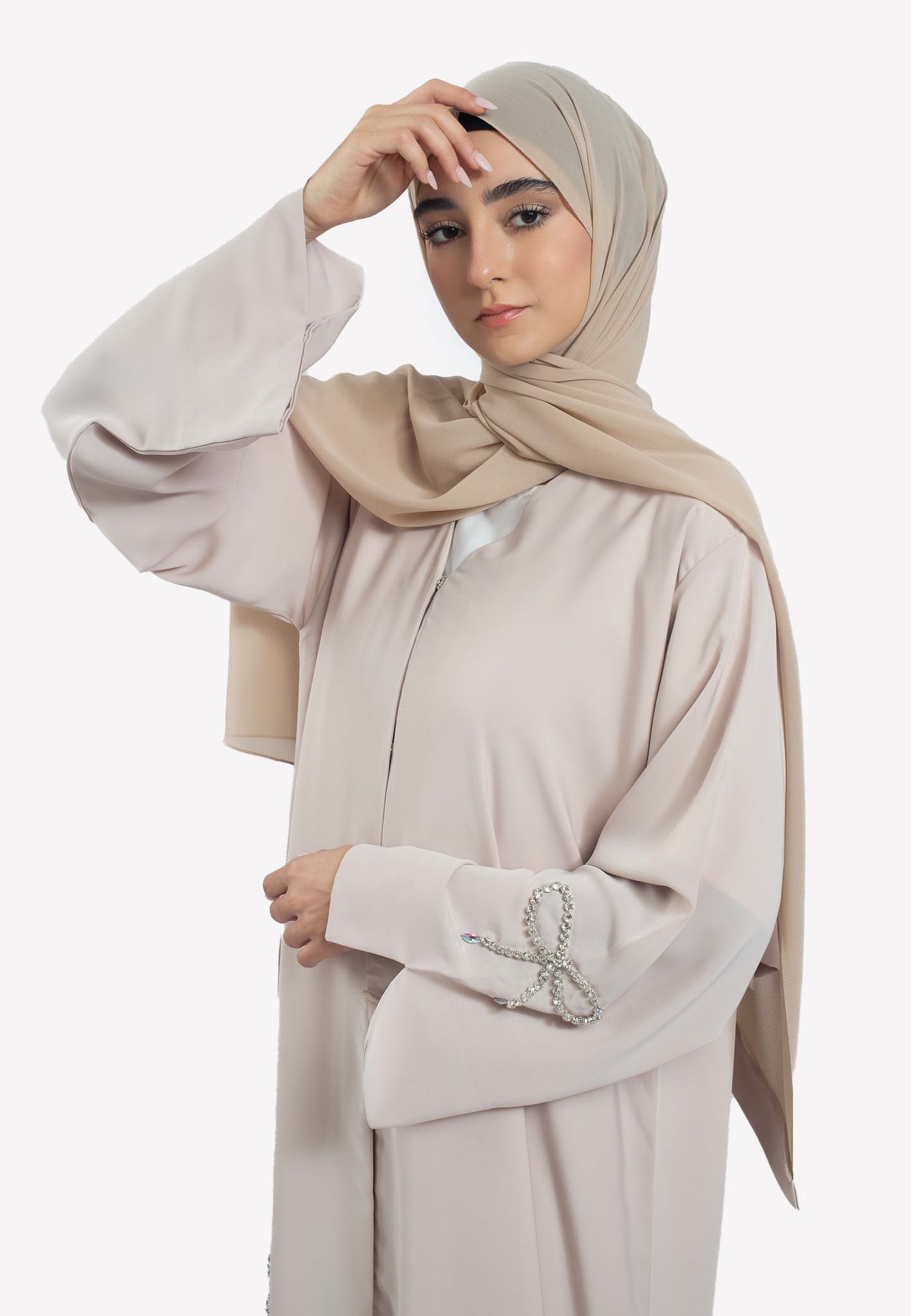 Infuse your wardrobe with a touch of modern femininity with our Beige Bow Embellished Abaya. This unique piece is defined by its charming bow embellishments, meticulously placed along the sleeves and side panels for a sophisticated, textured look. Crafted from our signature Premium Nida fabric, the rich beige hue offers a luminous finish and a graceful, fluid drape. Featuring versatile snap buttons, this open abaya can be effortlessly styled for both casual and formal occasions, arriving with a matching hijab to complete the set.