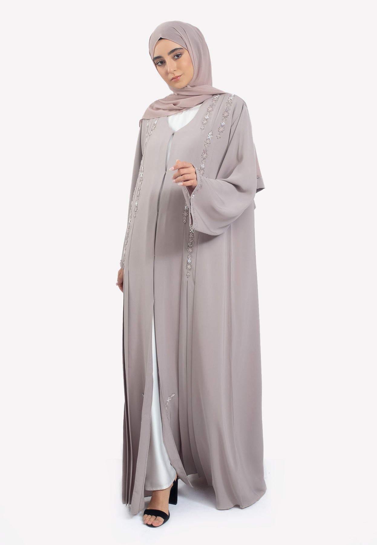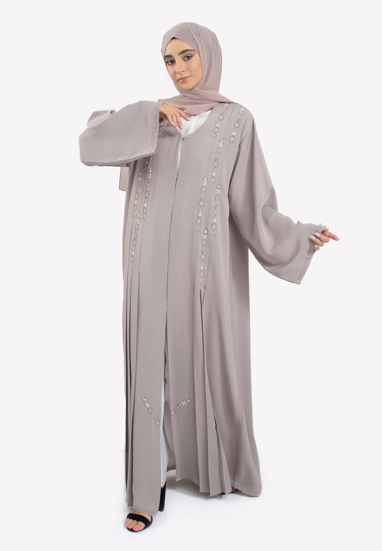 The Silvered Graphite Abaya is a masterclass in texture and refined detail. This open abaya features sharp, vertical pleats along the front panels, creating a structured, elongated silhouette that adds a modern architectural edge to your look. The design is elevated by intricate, hand-stitched crystals that catch the light with subtle brilliance, providing a sophisticated contrast against the deep grey fabric. Crafted from our signature Premium Nida, this piece offers a weighted, luxurious drape that ensures the pleats stay crisp and the movement remains fluid.