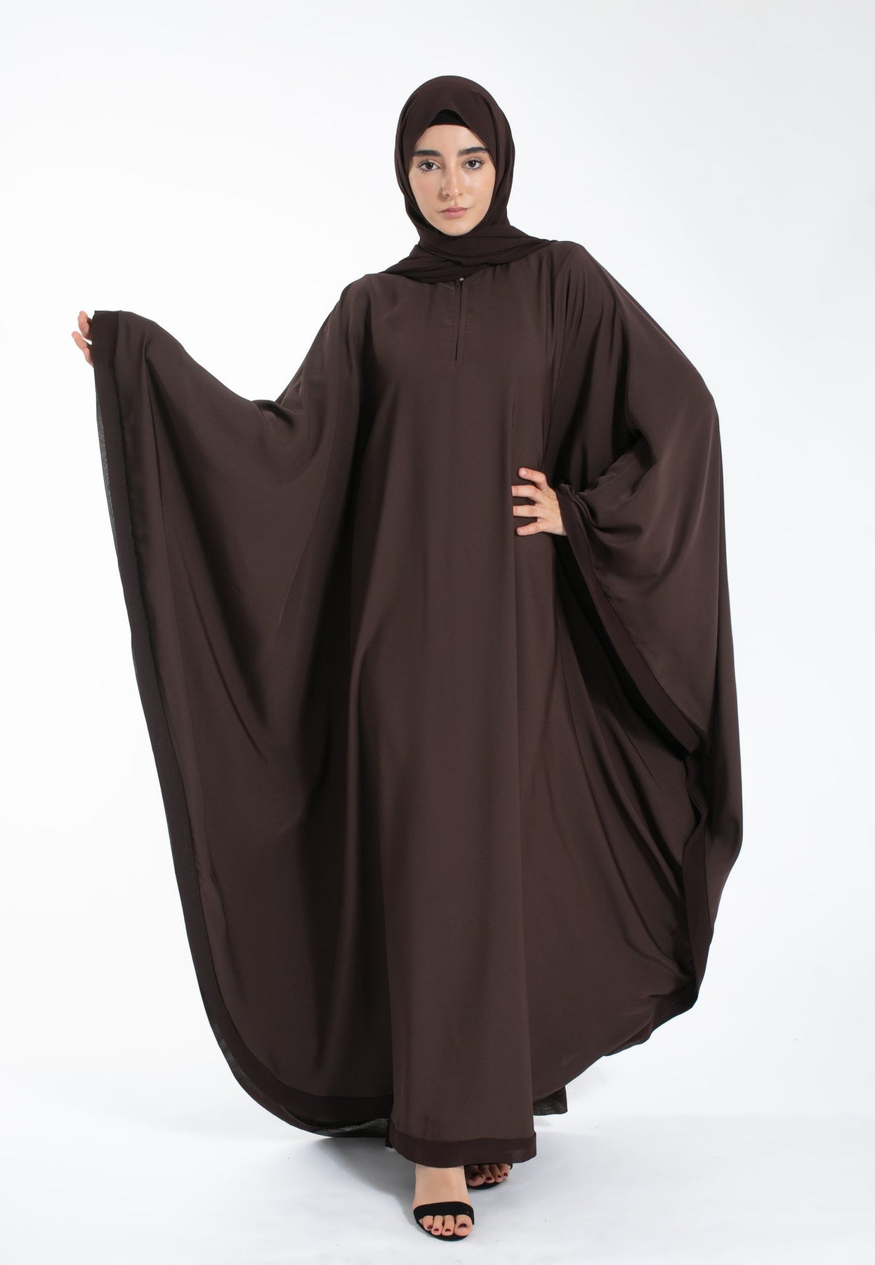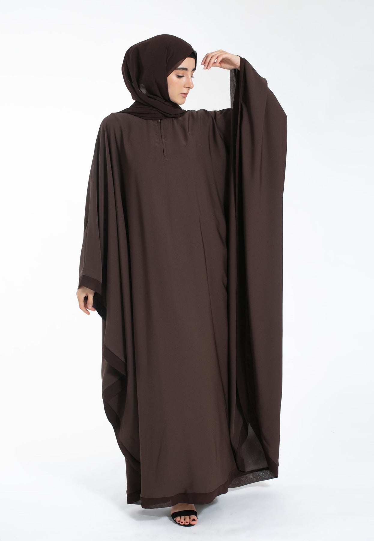 Elevate your wardrobe with our plain brown butterfly Farasha. Crafted from premium Nida fabric, it's lightweight and durable with a flattering butterfly cut suitable for all shapes and sizes. The zip neck opening and minimal chiffon edges add elegance and practicality, making it perfect for Ramadan, Eid, and intimate gatherings. Enhance your collection with this versatile and timeless piece.