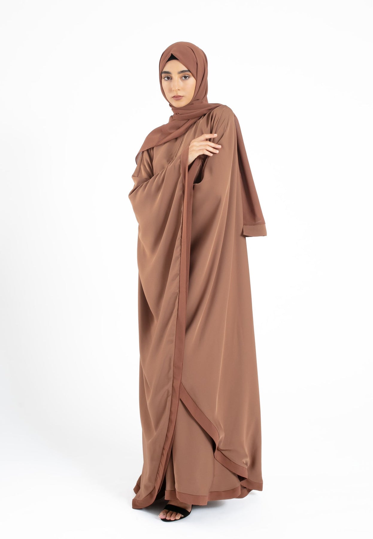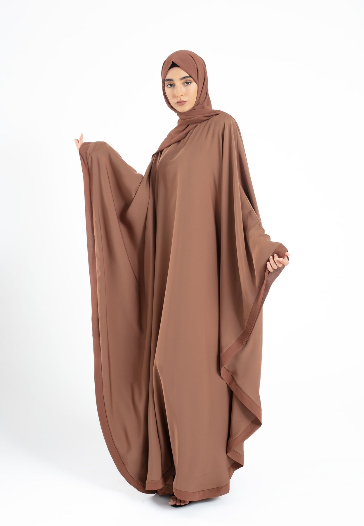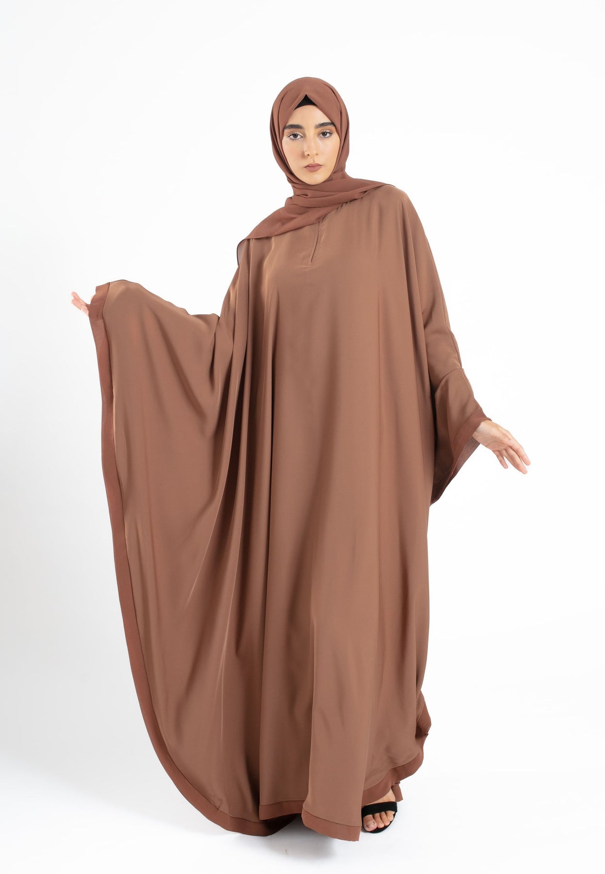 Elevate your wardrobe with our plain toffee butterfly Farasha. Crafted from premium Nida fabric, it's lightweight and durable with a flattering butterfly cut suitable for all shapes and sizes. The zip neck opening and minimal chiffon edges add elegance and practicality, making it perfect for Ramadan, Eid, and intimate gatherings. Enhance your collection with this versatile and timeless piece.