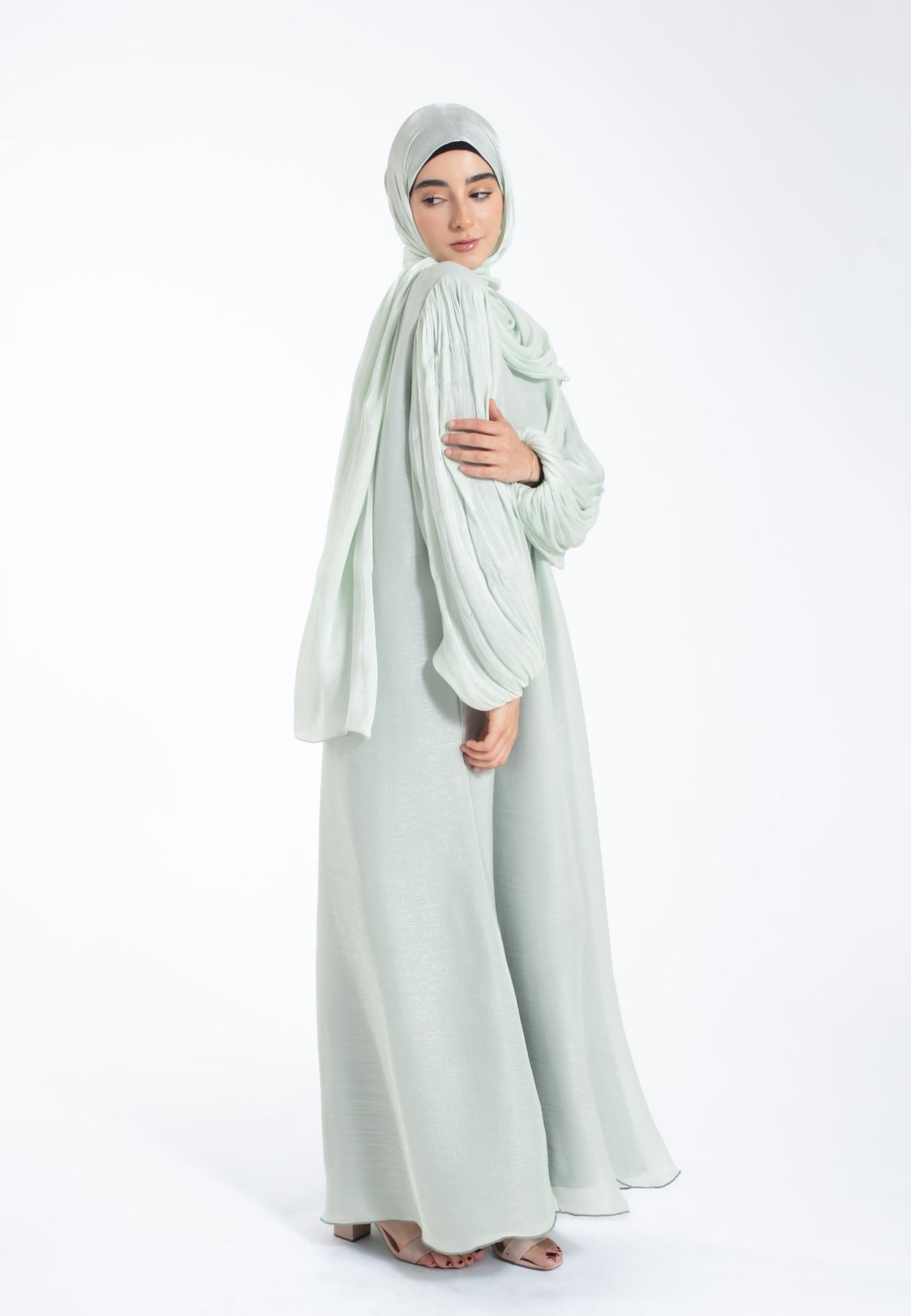 Introducing the Mint Organza Dainty Embellished Closed Abaya, crafted from premium organza silk. This abaya features a soft mint hue and shimmers beautifully. The standout balloon elasticated sleeves are adorned with dainty star embellishments, adding a touch of elegance and charm. Lined with a soft, lightweight fabric, this abaya ensures ultimate comfort and breathability making it perfect for summer and holidays.
