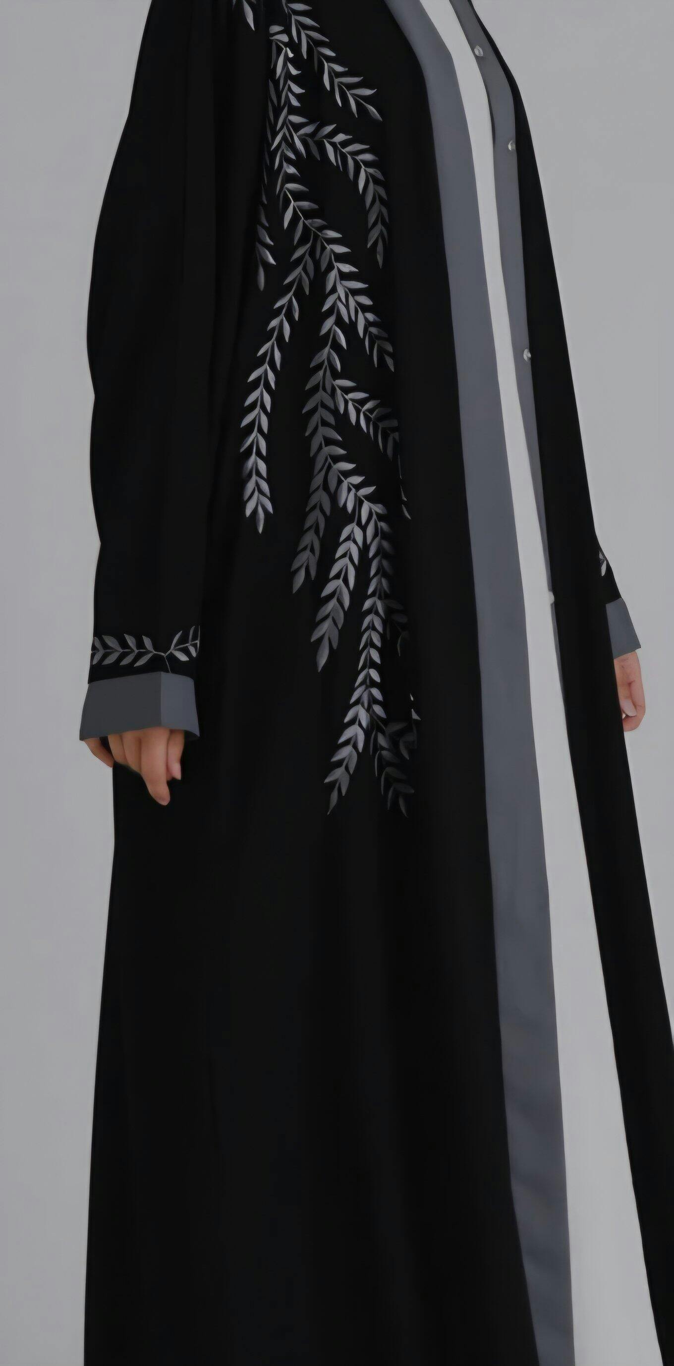 Crafted from rich black Nida fabric with stone grey leaves embroidery on the front and sleeves of the abaya. This minimal yet elegant abaya is perfect for Ramadan evenings. Style the abaya with the belt provided for a more defined look and a black pair of heels. Perfect for Eid, Ramadan or a casual evening out.