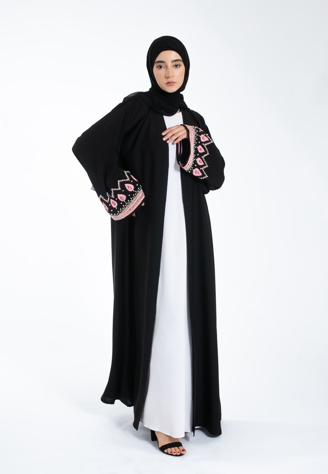 This exquisite piece features delicate Sakura Pink hand embroidery, meticulously crafted to create a captivating pattern. It's brought to life with hand-stitched crystals and gems. It's made with premium Nida fabric that drapes beautifully, offering both comfort and a flattering silhouette. Features snap buttons on front to allow versatile styling, whether you prefer a casual look or a more formal appearance. Perfect for Eid, Ramadan, religious gatherings or a casual evening out.