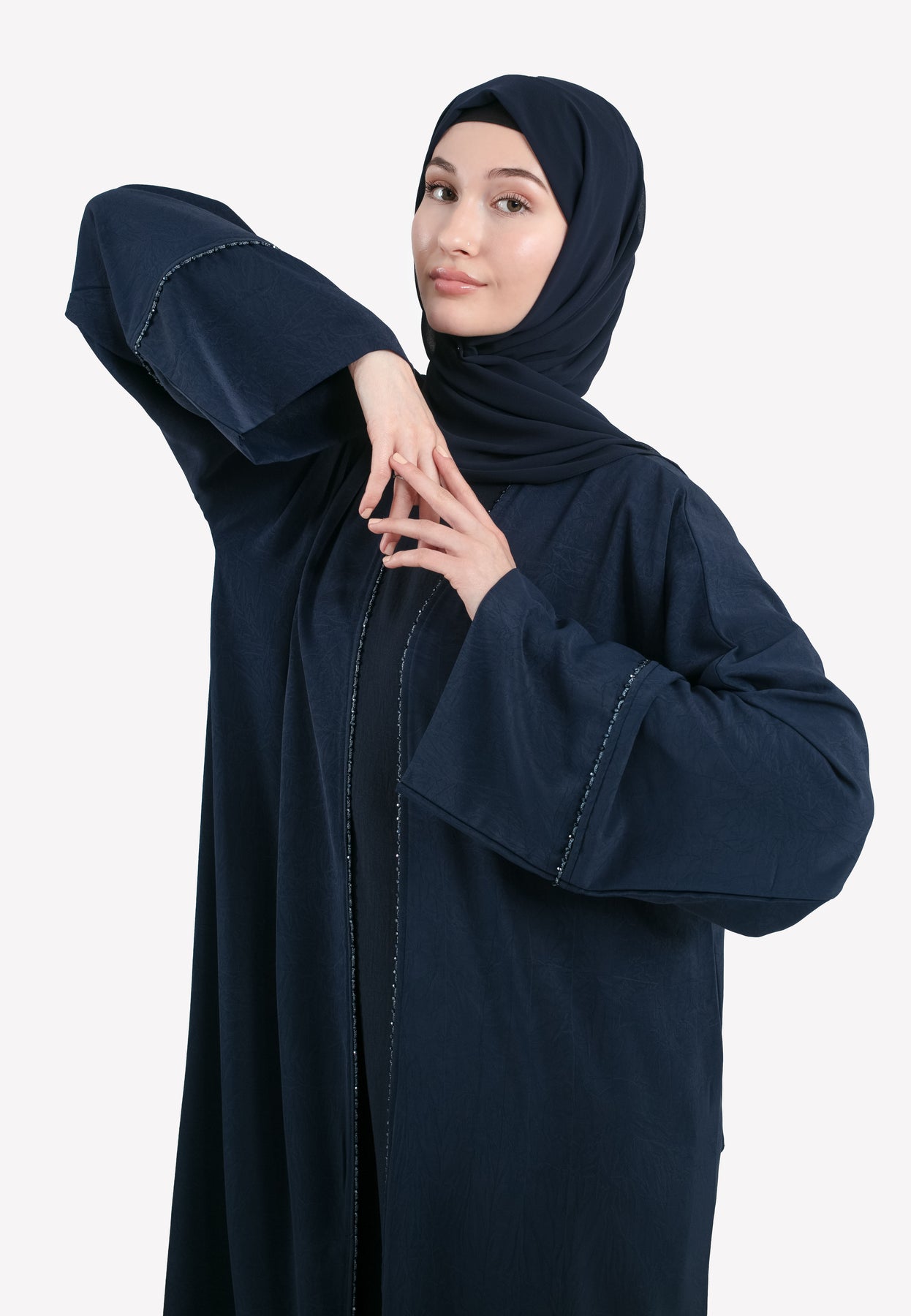 Elevate your wardrobe with our Navy Four-Piece Open Abaya Set, designed for timeless elegance and effortless modesty. Featuring delicate lace accents on the cuffs and lapel, this stylish open abaya brings a refined touch to any formal event. Made for comfort and beauty, it includes a soft crush fabric slip dress, matching hijab, and belt for a complete, coordinated look. The rich navy tone adds classic charm, perfect for both everyday grace and special gatherings.