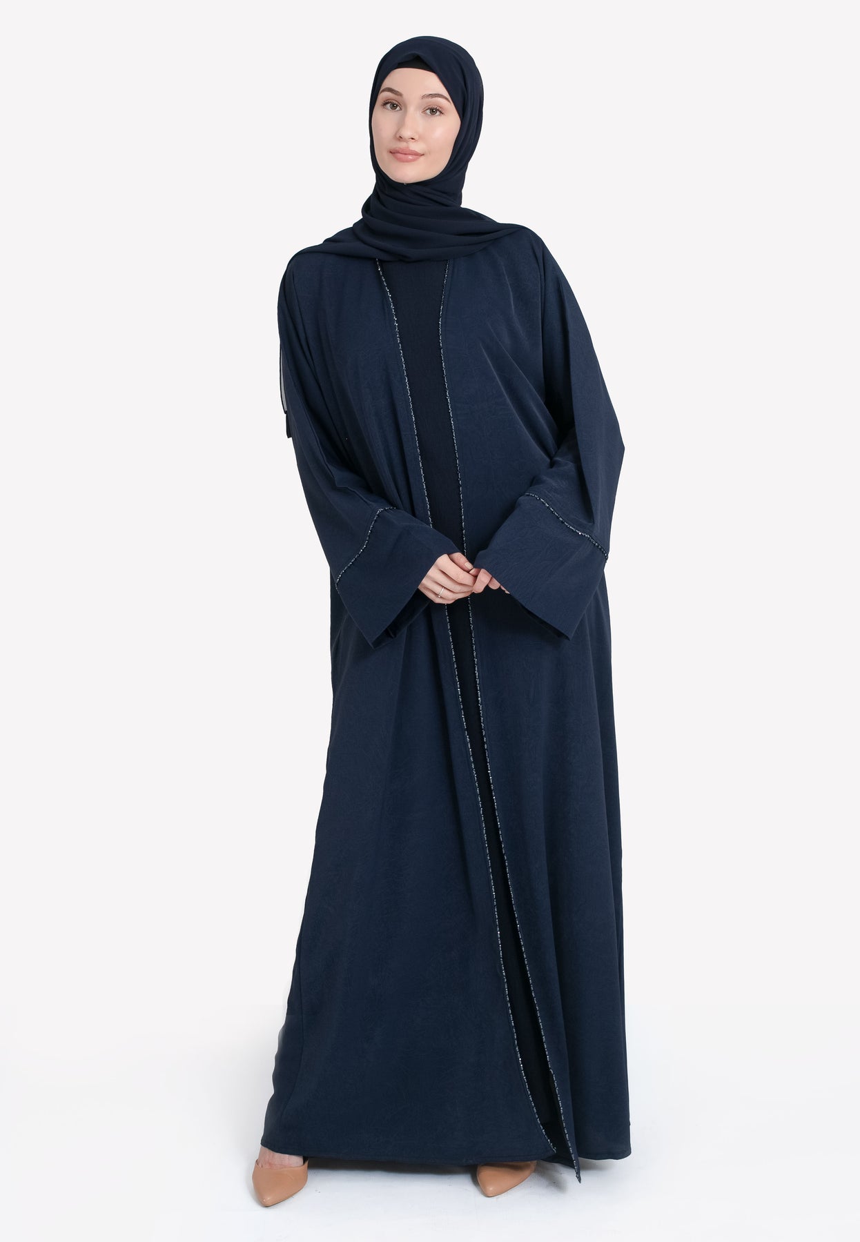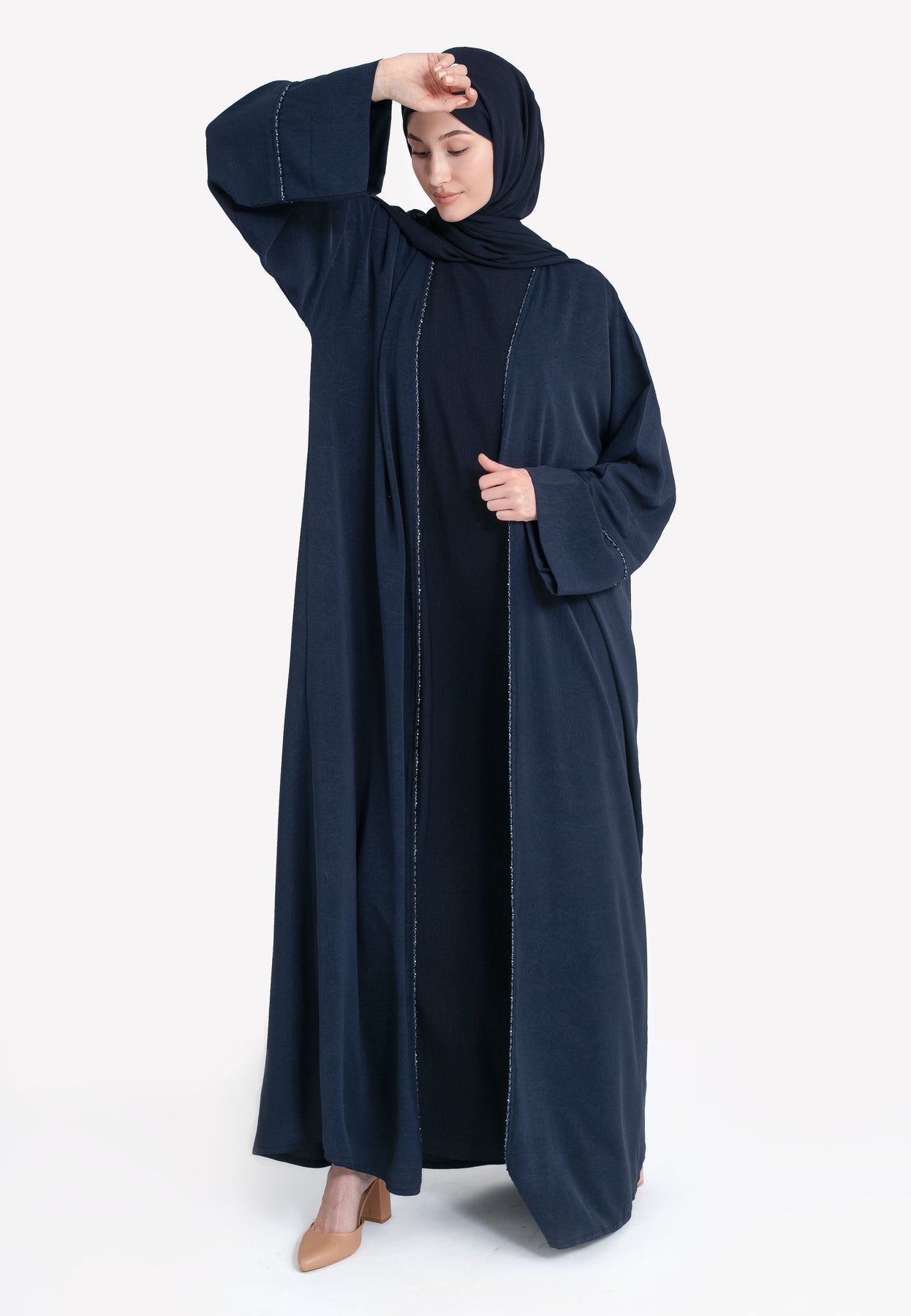 Navy Four-Piece Open Abaya Set With Dainty Detailing