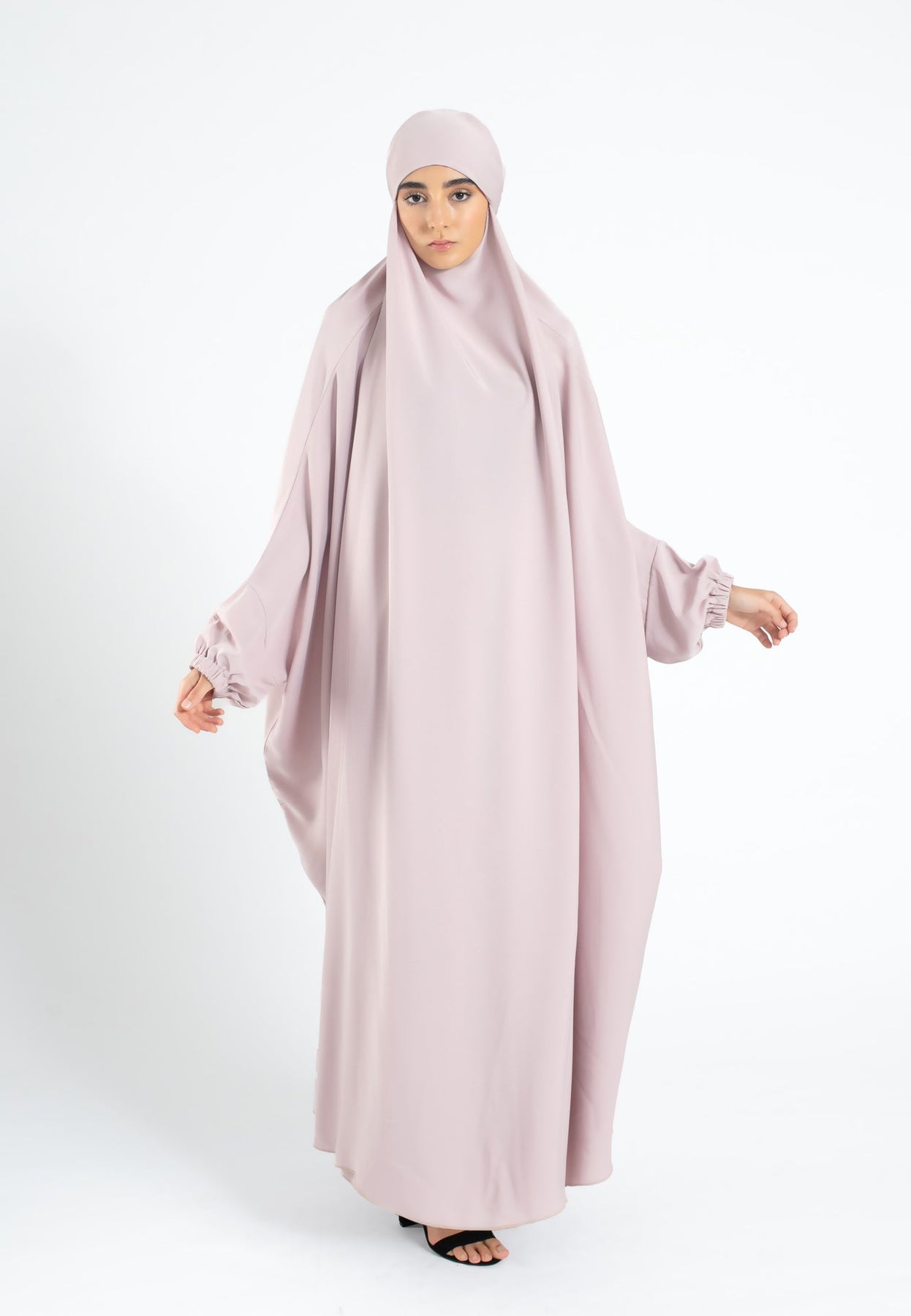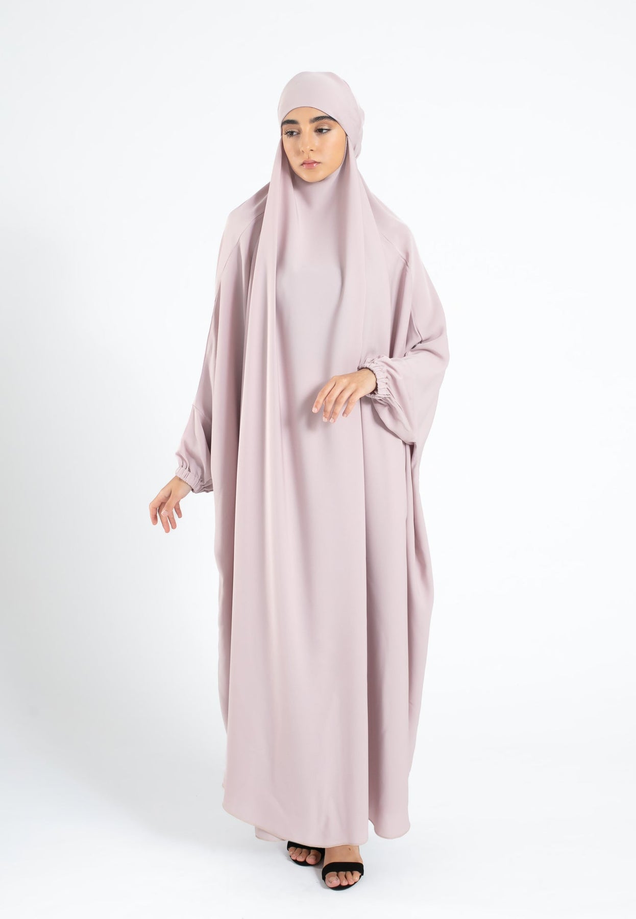 Crafted from lightweight Nida material, this comfortable jilbab features elasticated cuff sleeves and versatile tie-backs. Perfect for Ramadan, prayers, Hajj, and Umrah, it offers both style and comfort.