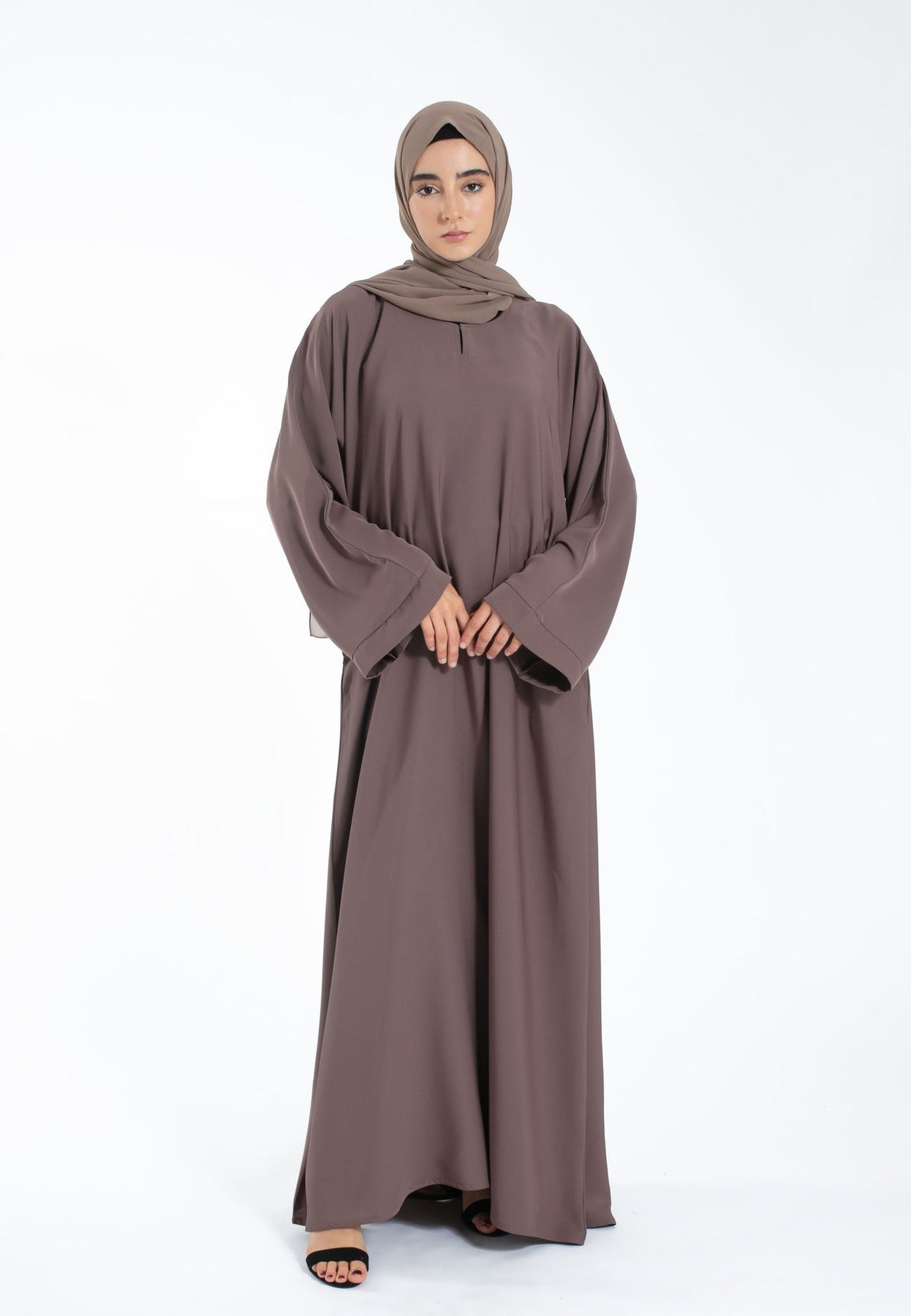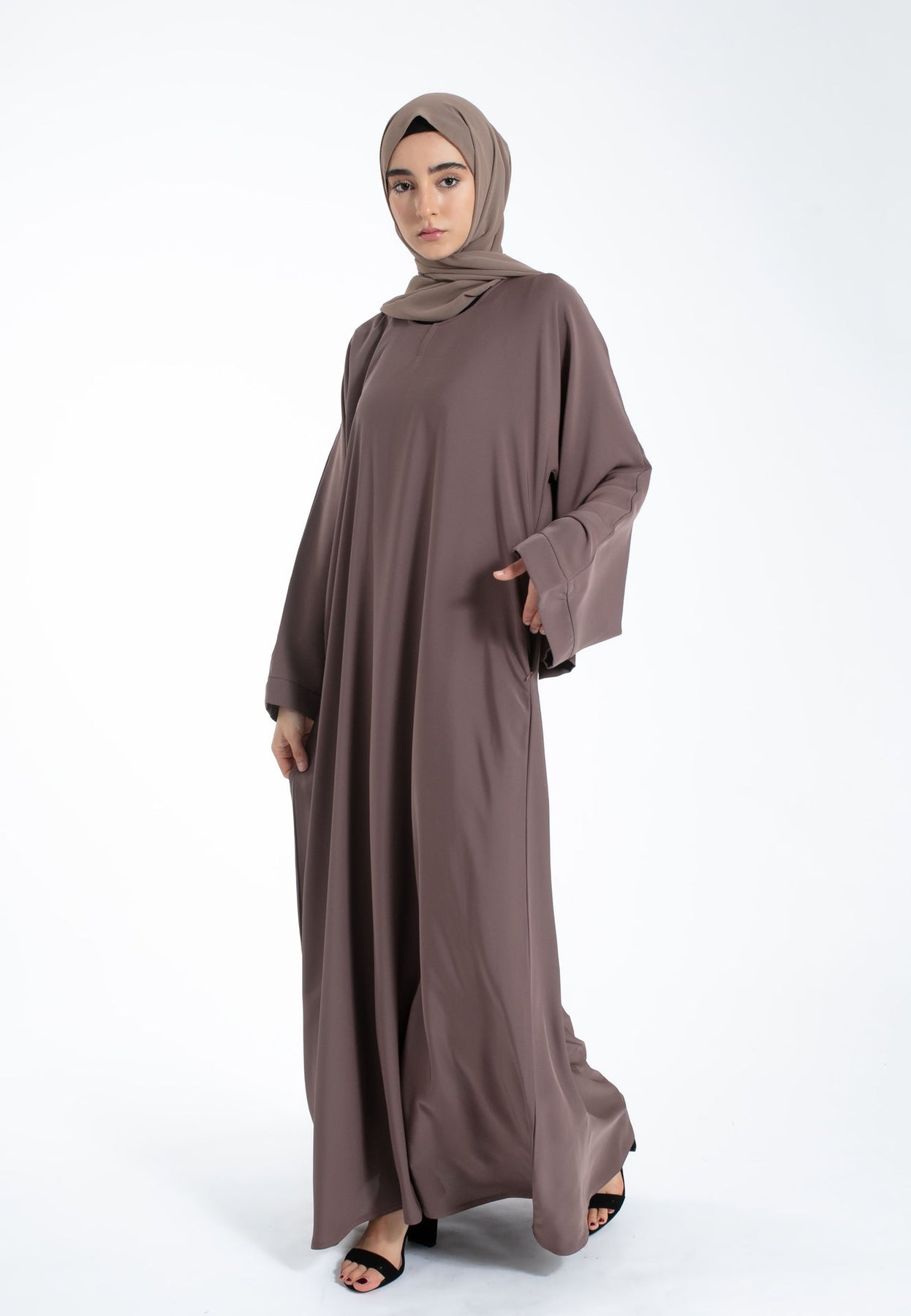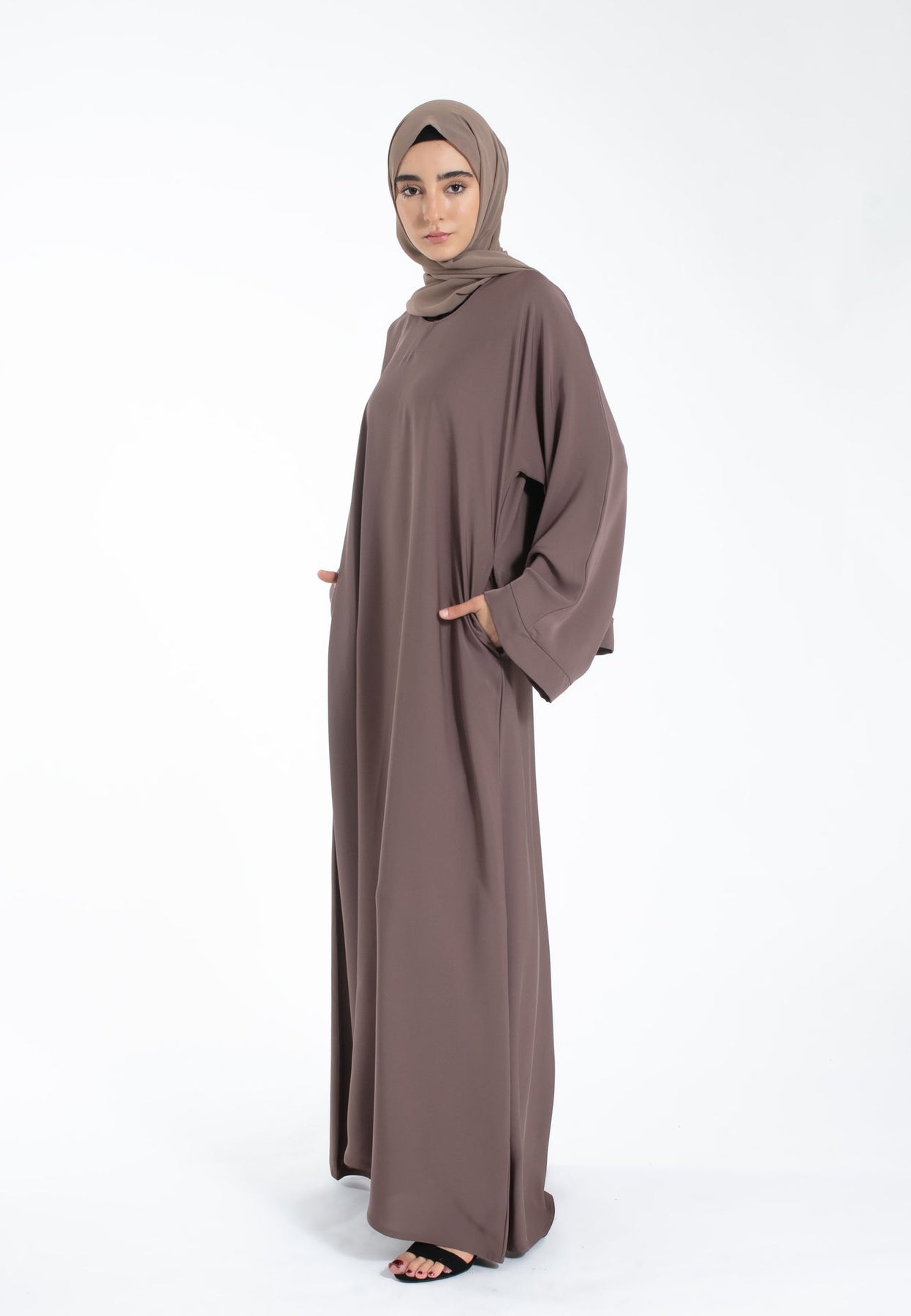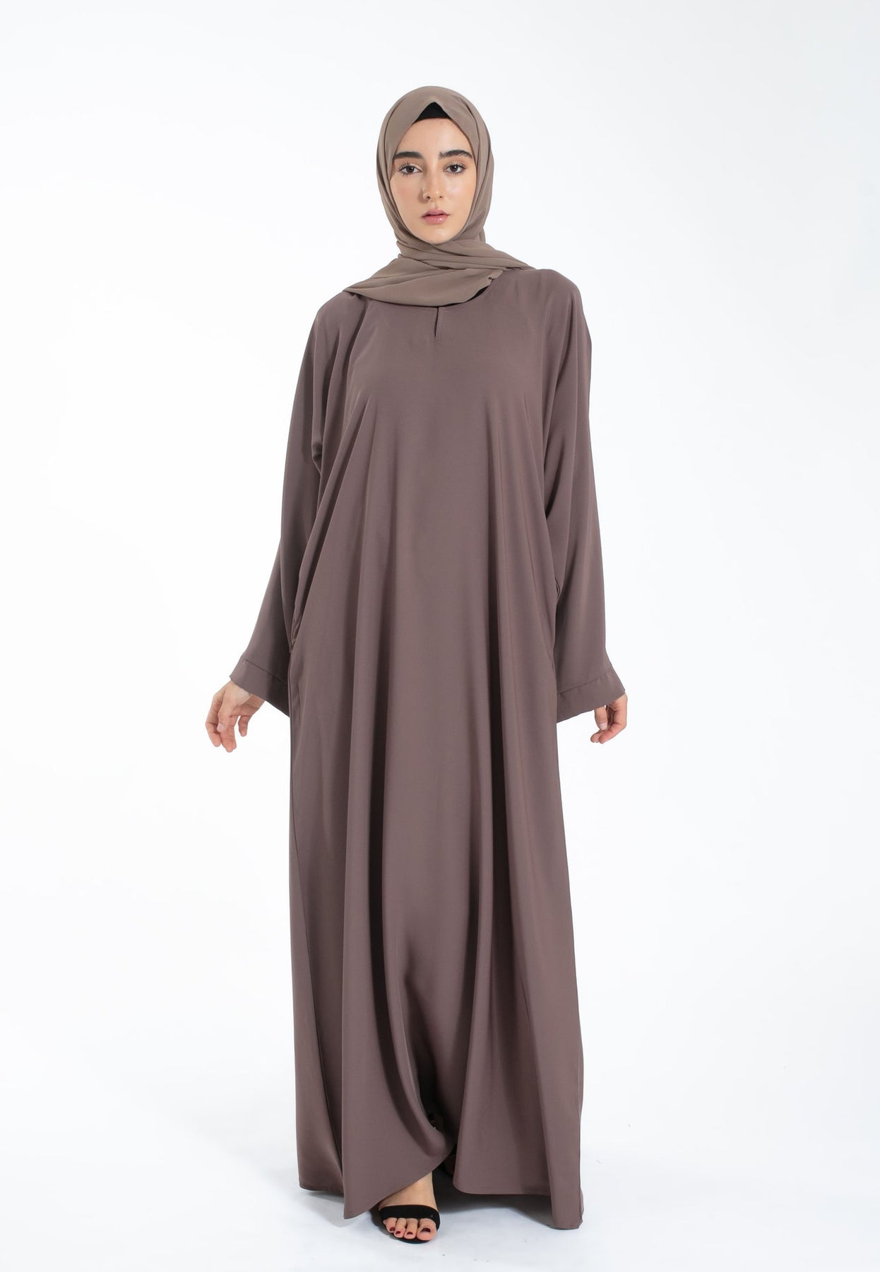 Elevate your modest wardrobe with our taupe closed abaya. Crafted from premium Nida fabric, it features sophisticated wide sleeves, practical zip pockets, and a comfortable snap button neckline. Perfect for Hajj, Umrah, Ramadan, and everyday wear. Matching hijab included.