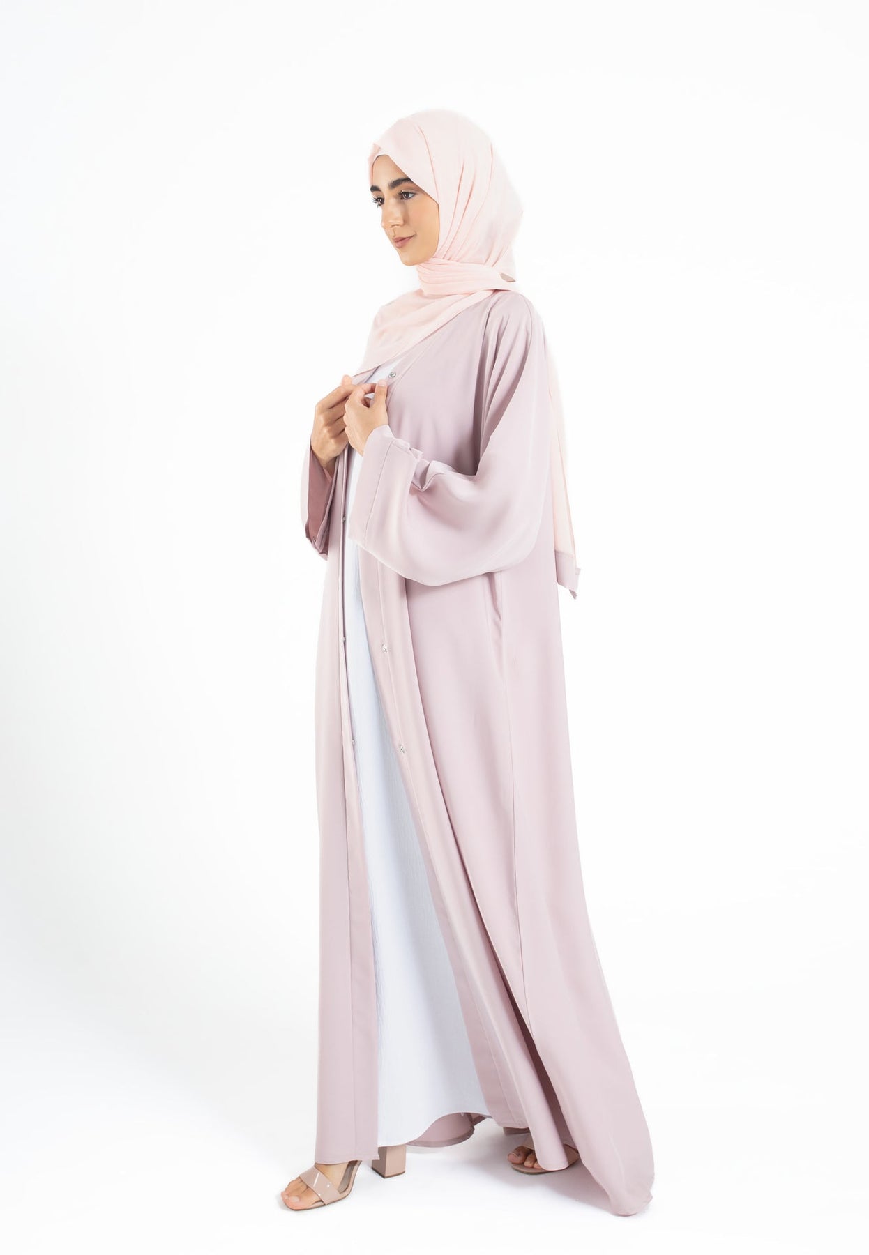 Stay stylish with our plain baby pink open abaya with wide sleeves. Featuring snap buttons on front and crafted from premium Nida, it's perfect for casual wear. Pair effortlessly with our inner slip dresses. Includes matching hijab and belt. Ideal for summer, daily wear and formal wear.