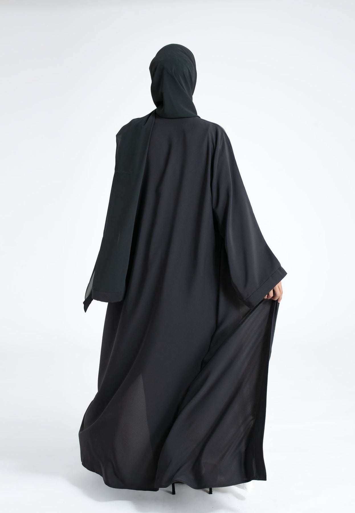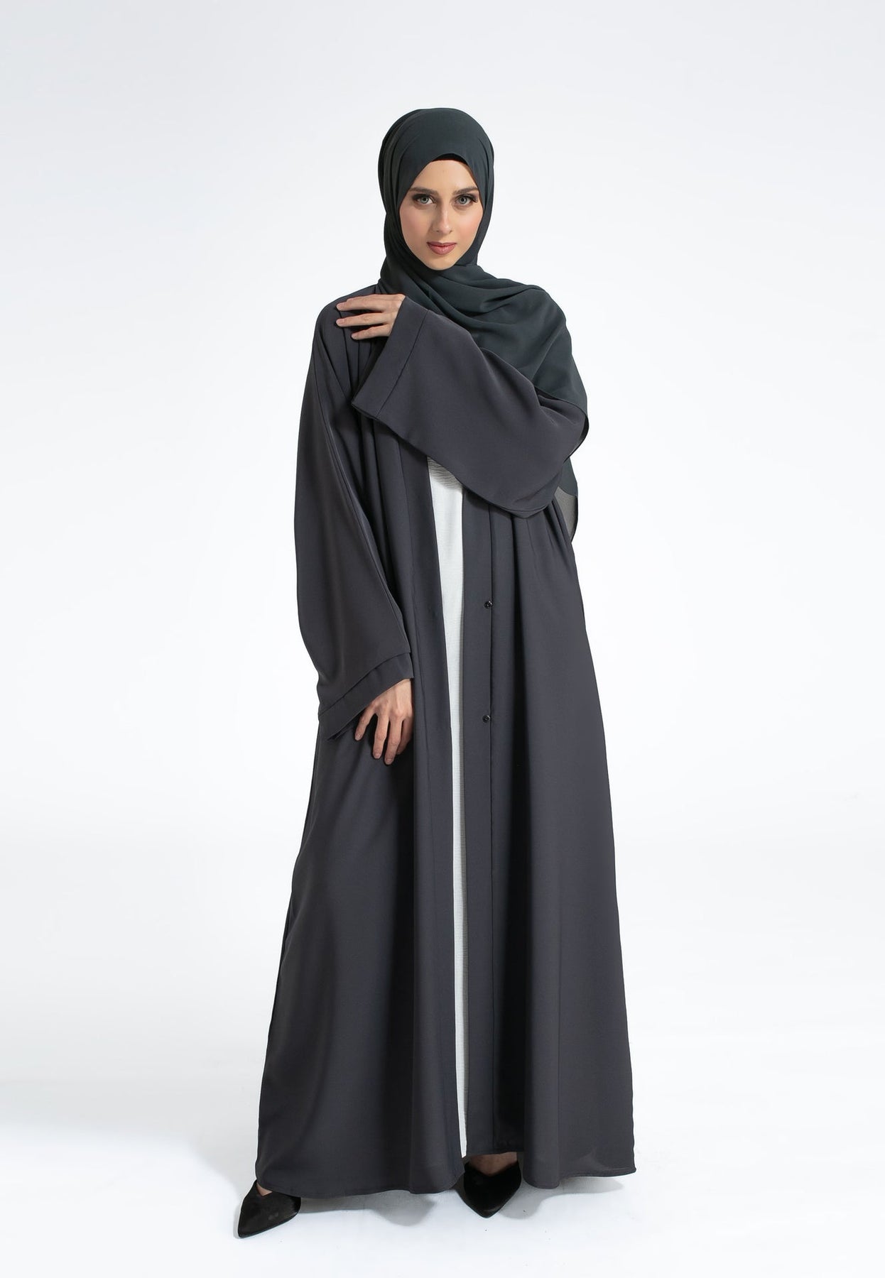 Stay stylish with our plain charcoal grey open abaya with wide sleeves. Featuring snap buttons on front and crafted from premium Nida, it's perfect for casual wear. Pair effortlessly with our inner slip dresses. Includes matching hijab and belt. Ideal for summer, daily wear and formal wear.