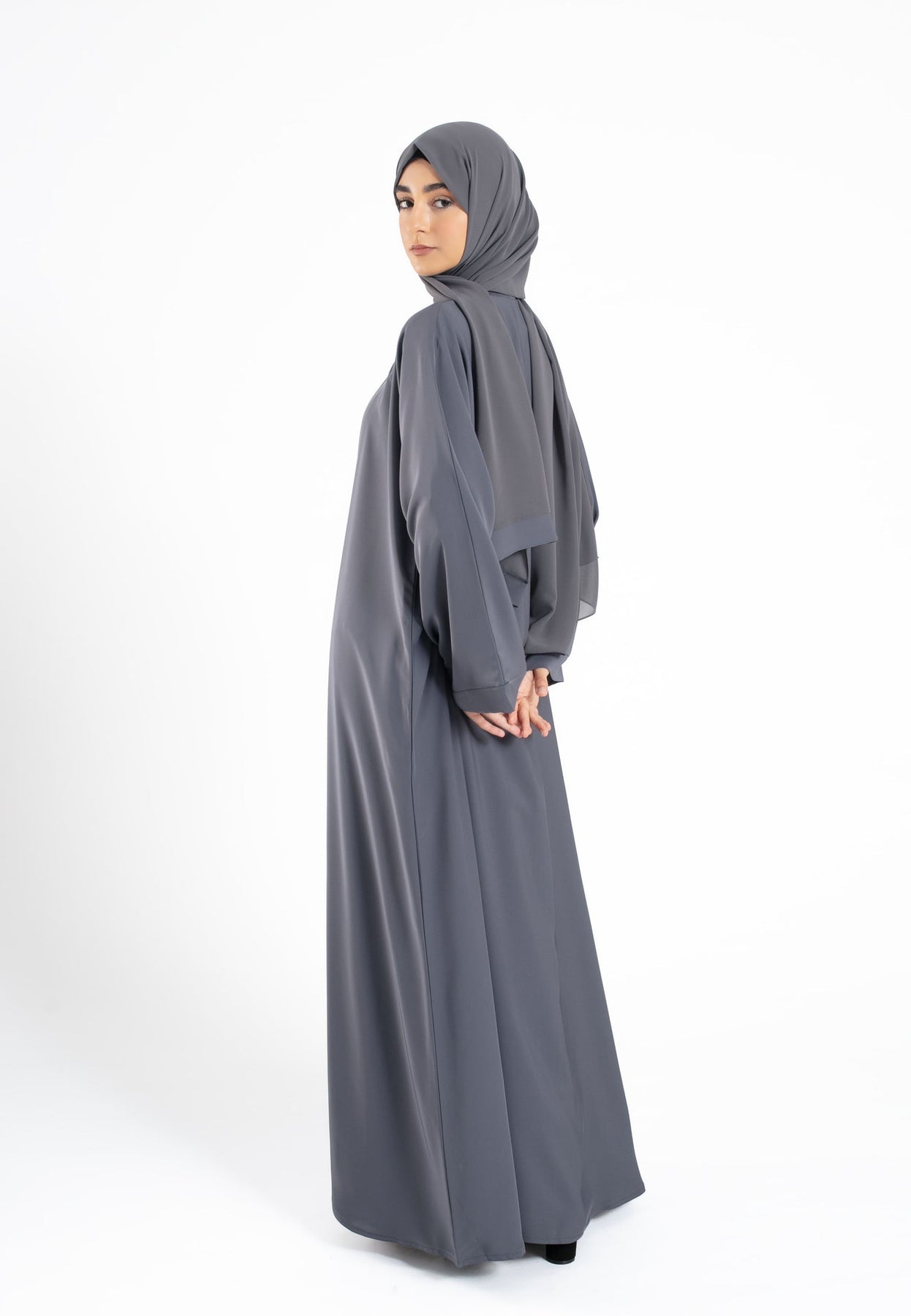 Stay stylish with our plain pebble grey open abaya with wide sleeves. Featuring snap buttons on front and crafted from premium Nida, it's perfect for casual wear. Pair effortlessly with our inner slip dresses. Includes matching hijab and belt. Ideal for summer, daily wear and formal wear.
