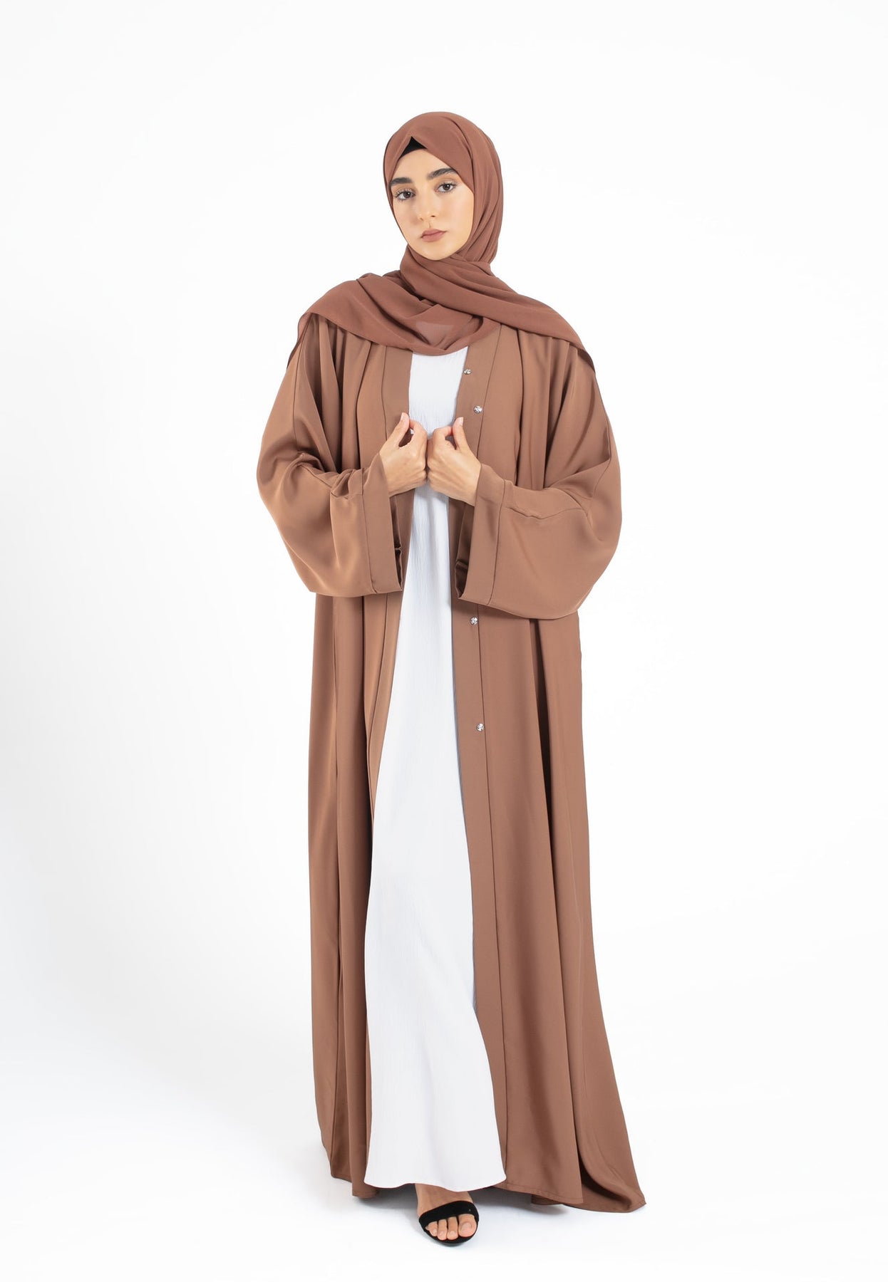 Stay stylish with our plain toffee open abaya with wide sleeves. Featuring snap buttons on front and crafted from premium Nida, it's perfect for casual wear. Pair effortlessly with our inner slip dresses. Includes matching hijab and belt. Ideal for summer, daily wear and formal wear.