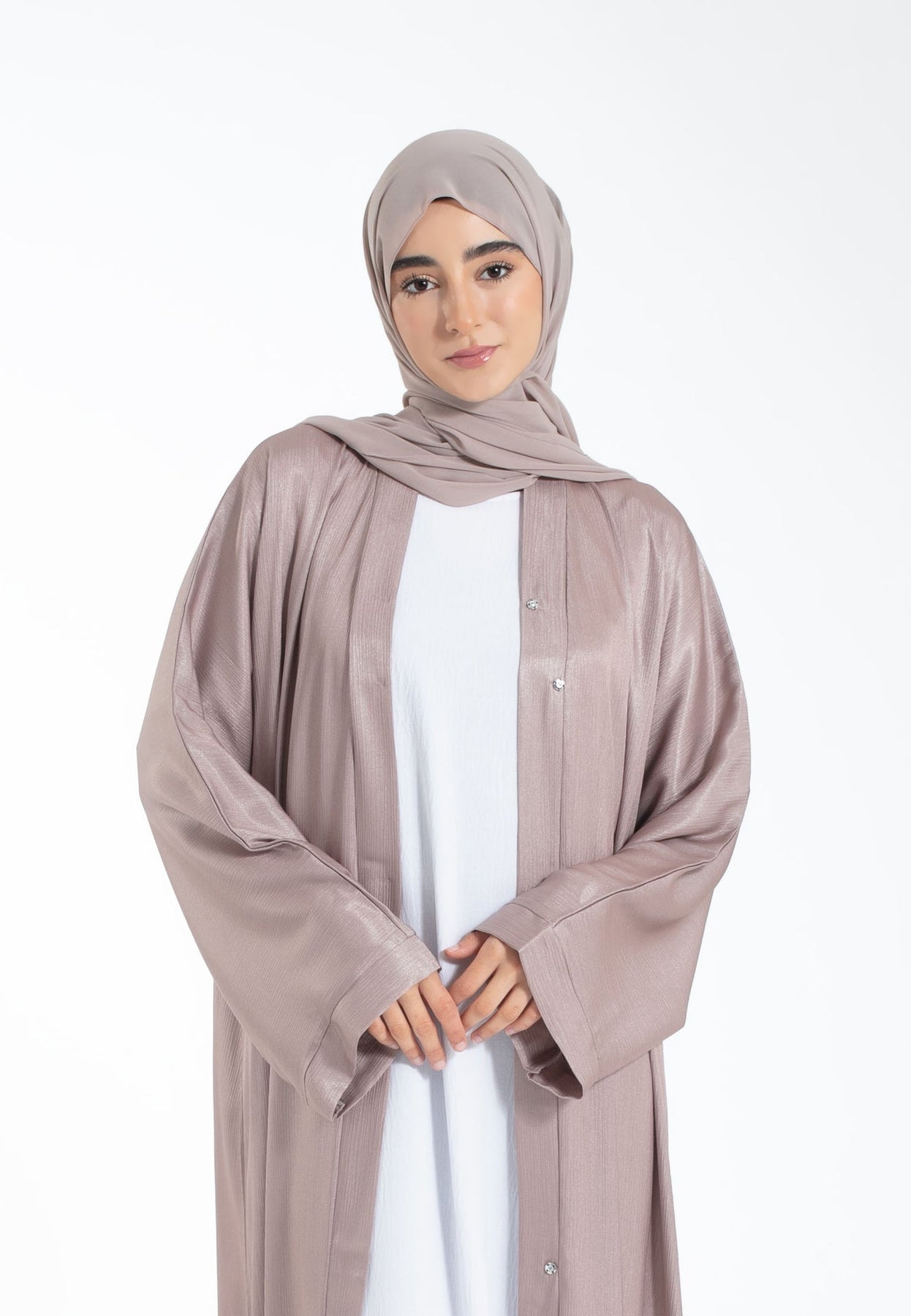 Elevate your wardrobe with the Shimmer Textured Open Abaya in stunning Mink. Crafted from lightweight, breathable polyester, this abaya is perfect for the summer months, Ramadan, Eid, or casual evenings out. Designed with convenient snap buttons on the front, it pairs effortlessly with any of our inner slip dresses. Complete your elegant look with the included matching hijab and belt. Experience timeless sophistication and comfort with this versatile addition to your collection.