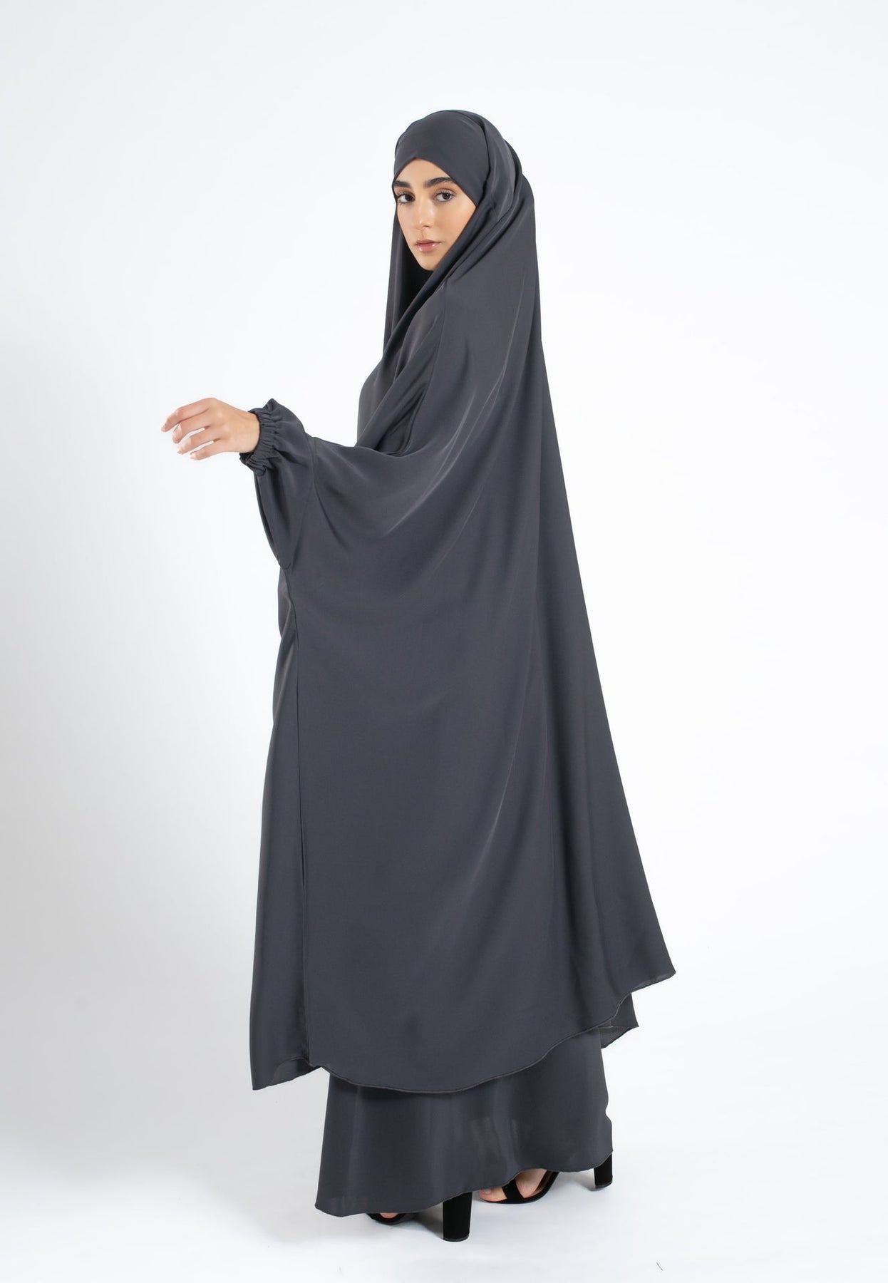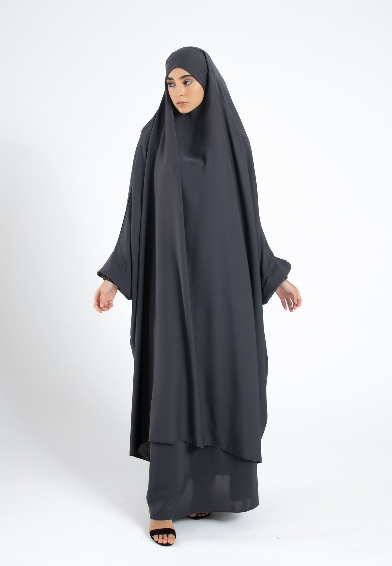 Two-Piece Jilbab / Prayer Set Dress With Elasticated Sleeves - Charcoal Grey