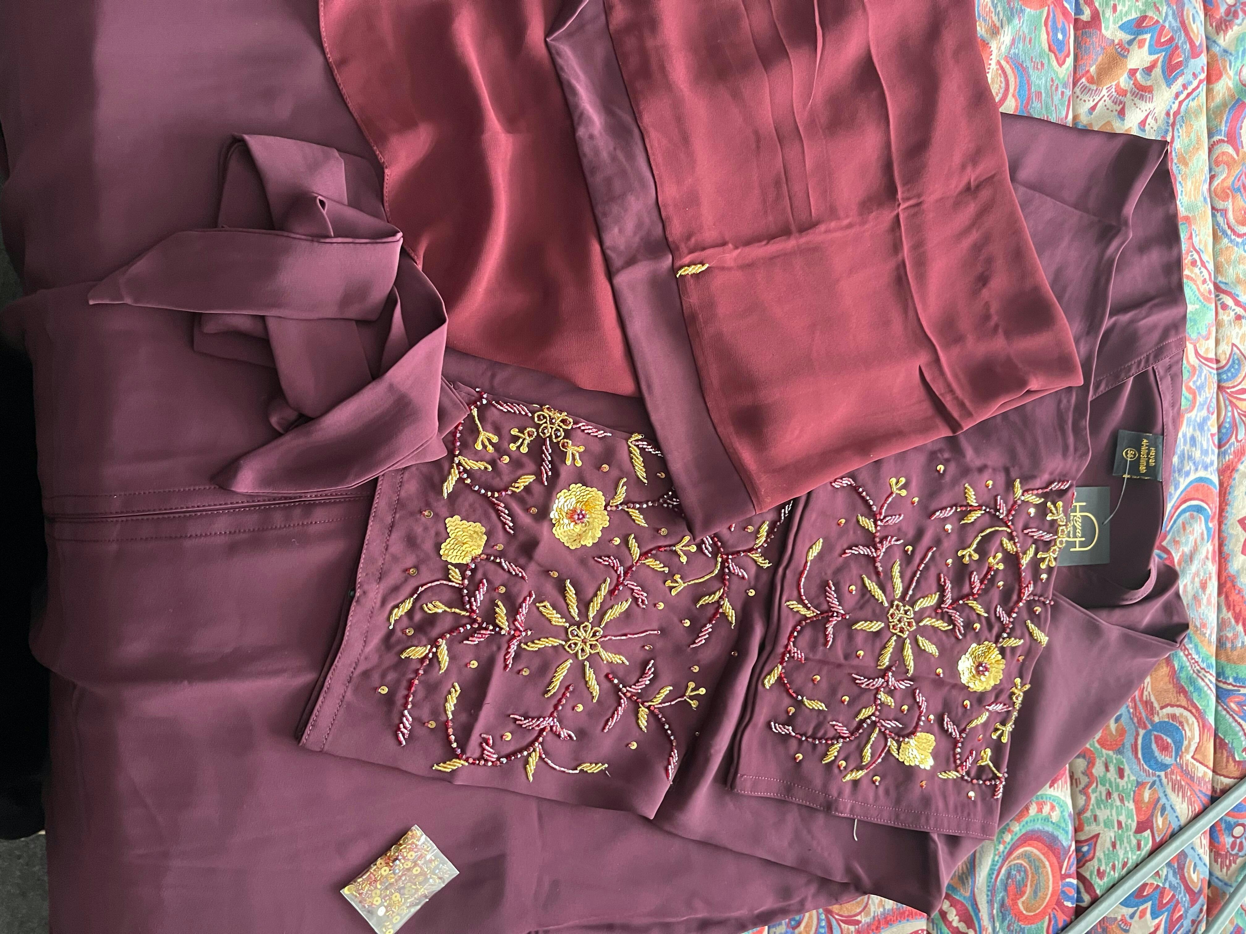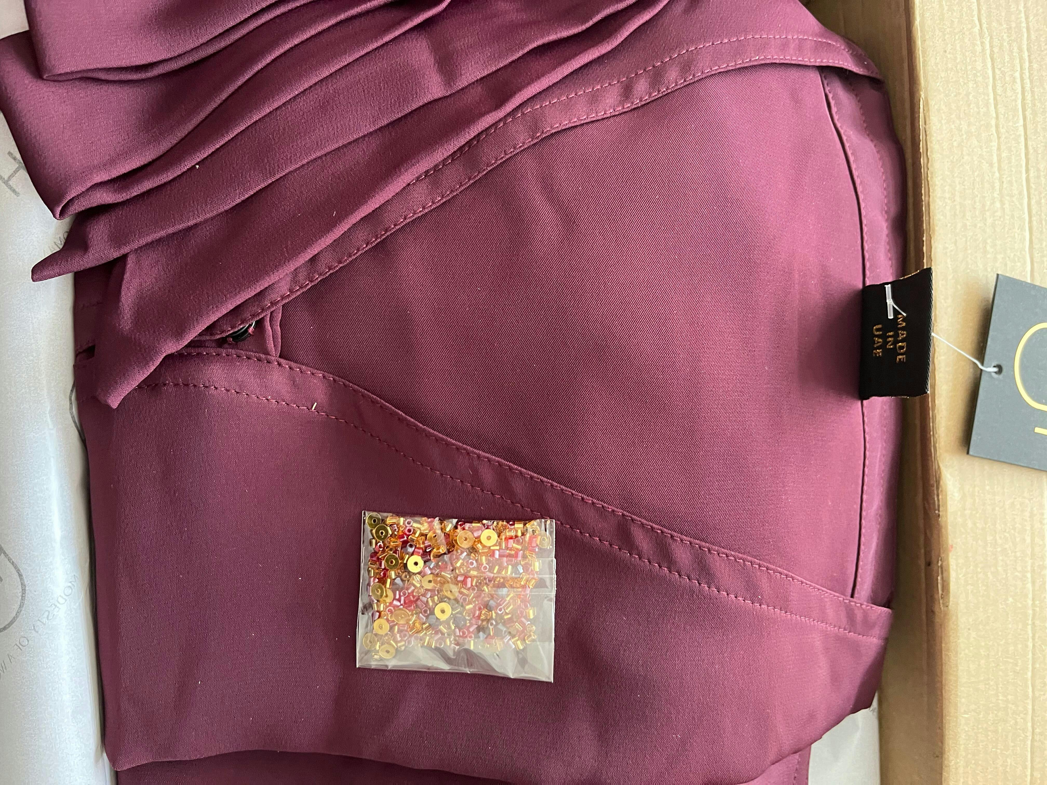 Indulge in pure elegance with our captivating Dark Cherry open abaya, fashioned from premium grade Nida material for optimum durability and a sumptuous feel. This exquisite piece is adorned with enchanting gold and maroon embellishments and sequins all meticulously hand stitched by our skilled artisans with the utmost care and attention to detail. Ideal for any occasion, this abaya radiates a timeless allure, offering a seamless ensemble with its matching hijab and belt. Whether you choose to pair it with our inner slips or wear it closed with your favourite heels, be prepared to make a lasting impression.