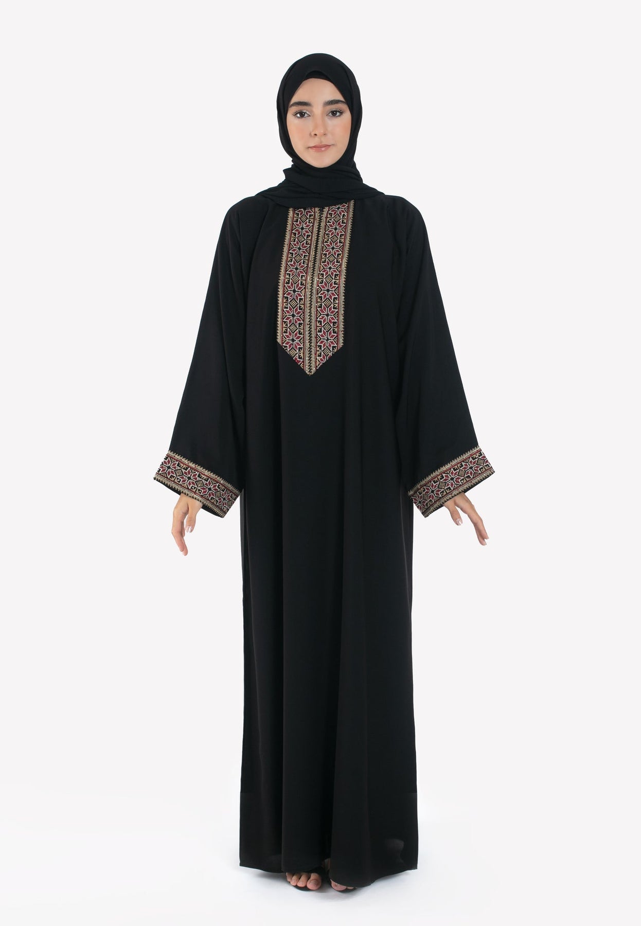 Embrace timeless tradition with our Palestinian Tatreez Closed Abaya, featuring intricate burgundy and gold Tatreez embroidery, delicately accented with shimmering stones. Crafted from luxuriously soft premium Nida fabric, this mandarin-colored abaya offers effortless sophistication with a front zip for easy wear. The matching hijab completes your modest ensemble, ideal for Iftar gatherings, prayers, or casual outings. Celebrate cultural artistry and versatile elegance—a statement piece blending heritage and contemporary style.