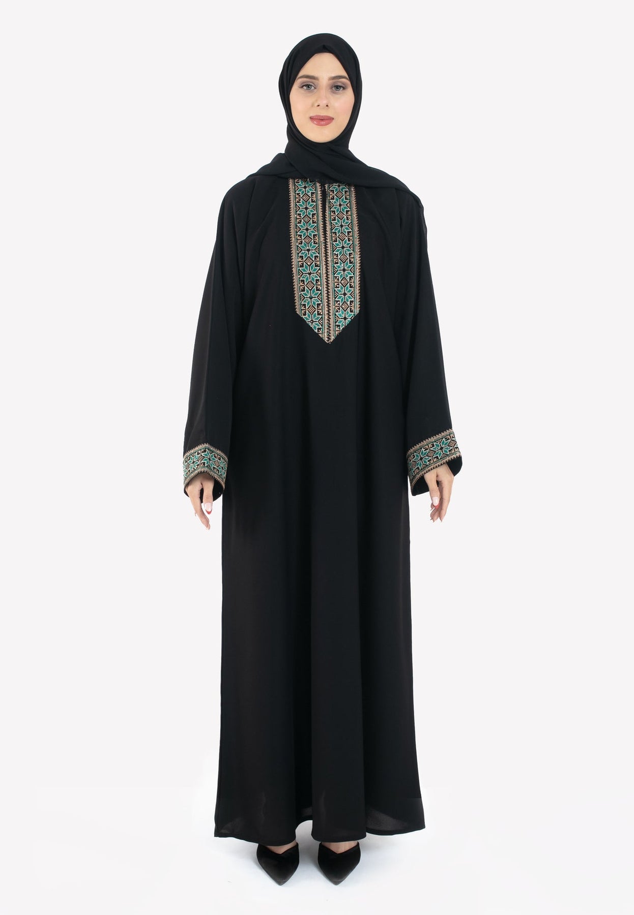 Embrace timeless tradition with our Palestinian Tatreez Closed Abaya, featuring intricate turquoise and gold Tatreez embroidery, delicately accented with shimmering stones. Crafted from luxuriously soft premium Nida fabric, this mandarin-colored abaya offers effortless sophistication with a front zip for easy wear. The matching hijab completes your modest ensemble, ideal for Iftar gatherings, prayers, or casual outings. Celebrate cultural artistry and versatile elegance—a statement piece blending heritage and contemporary style.