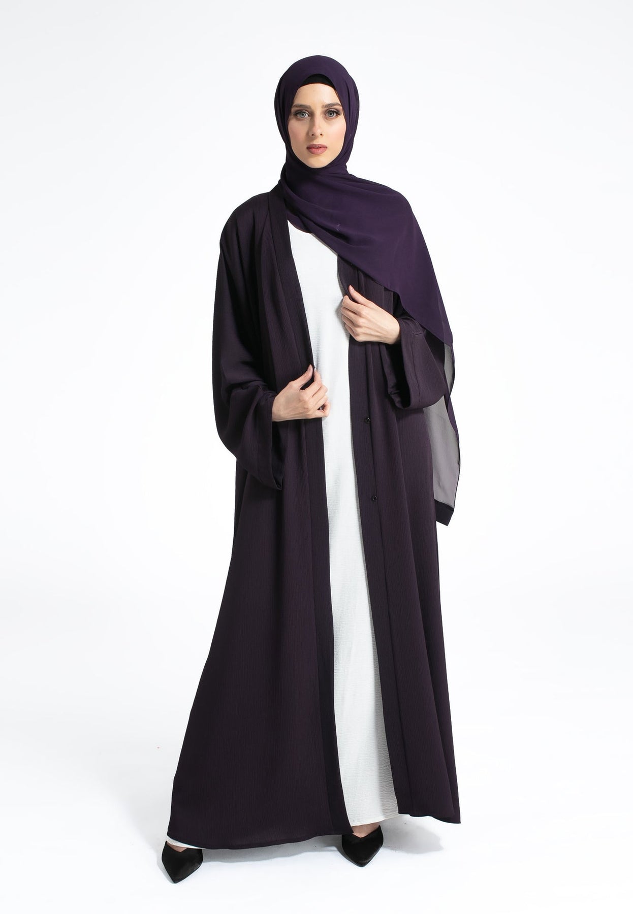 Stay stylish this summer with our Plain Deep Purple Textured Open Abaya. Featuring snap buttons and crafted from breathable polyester and crepe, it's perfect for casual wear. Pair effortlessly with our inner slip dresses. Includes matching hijab and belt. Ideal for everyday elegance.