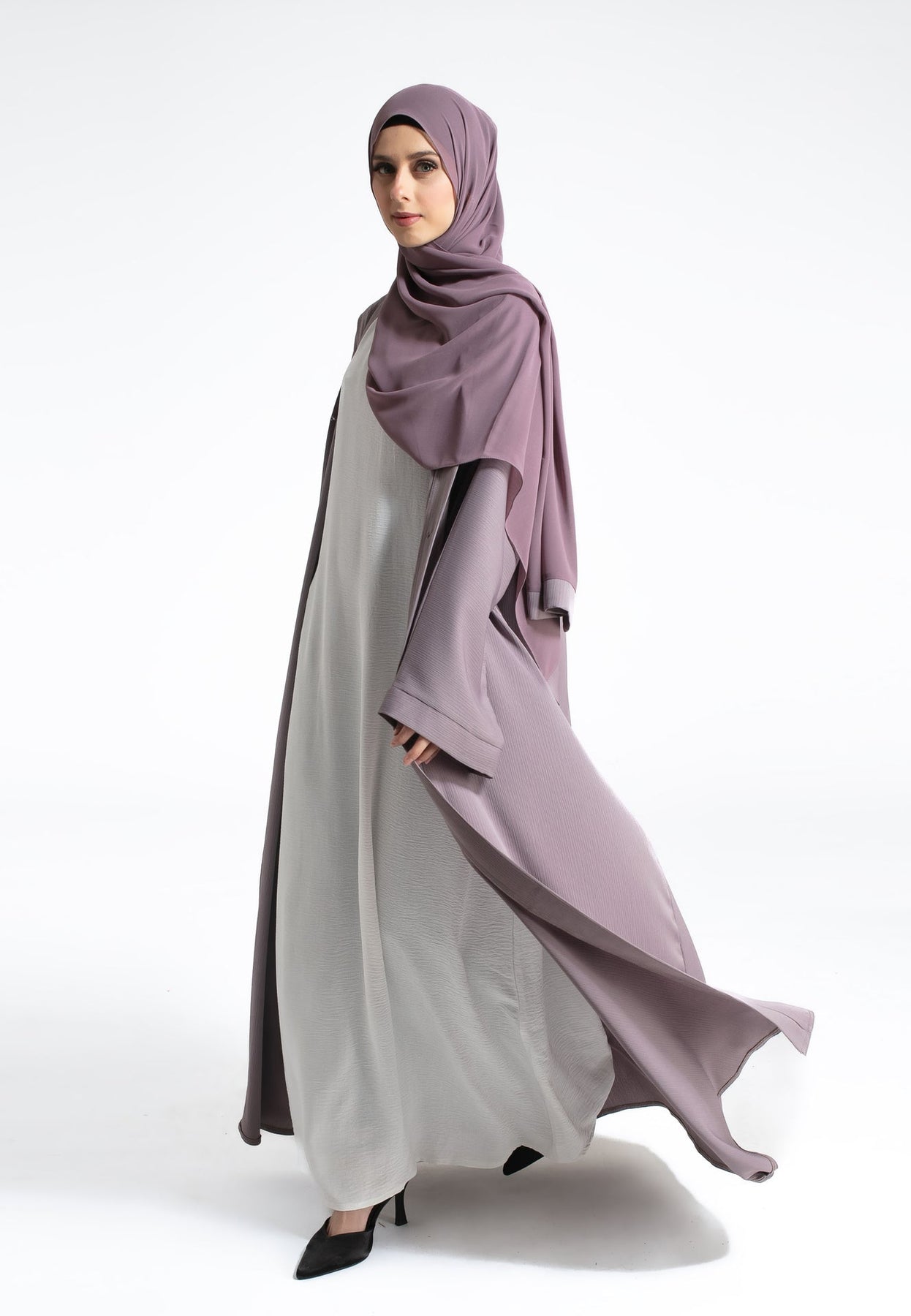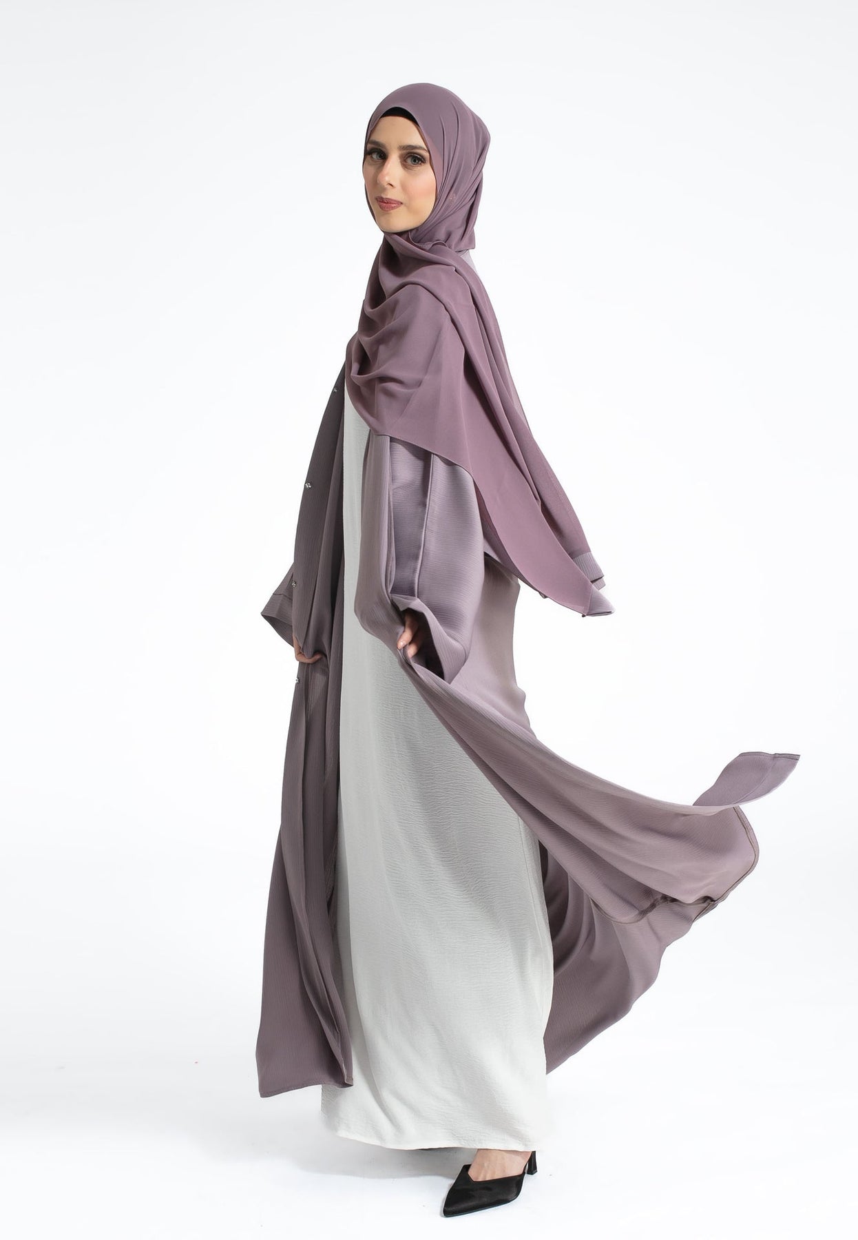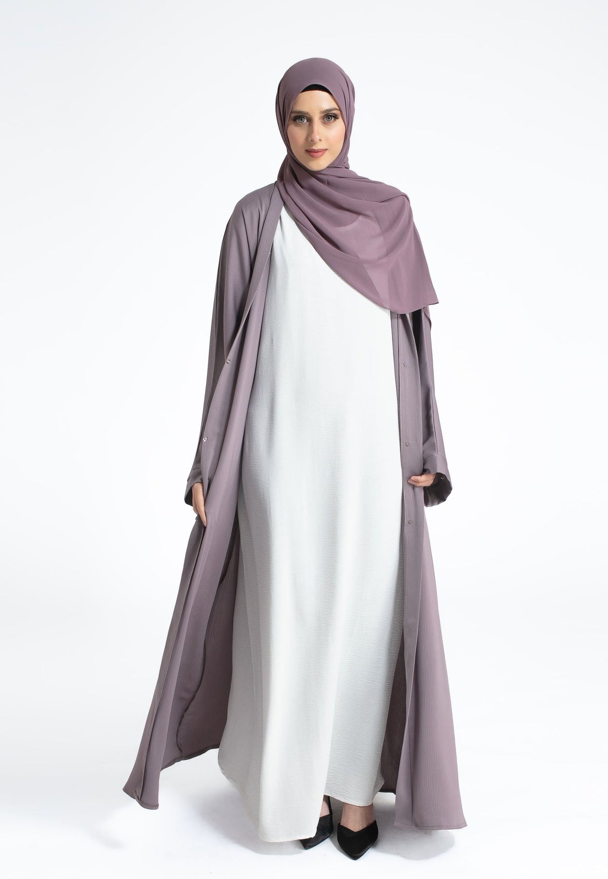 Stay stylish this summer with our Plain French Lilac Textured Open Abaya. Featuring snap buttons and crafted from breathable polyester and crepe, it's perfect for casual wear. Pair effortlessly with our inner slip dresses. Includes matching hijab and belt. Ideal for everyday elegance.