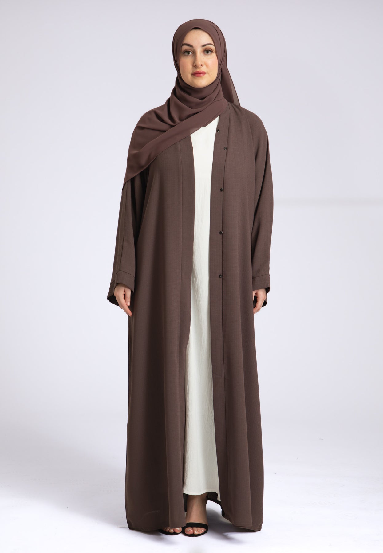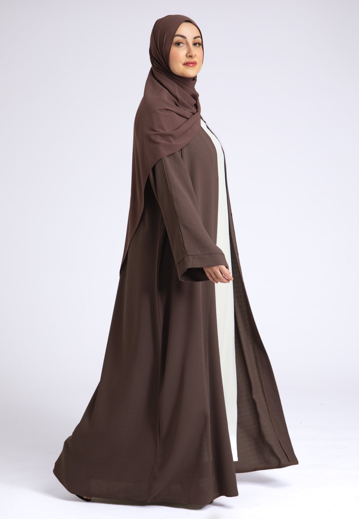Our simple yet elegant Taupe Linen open abaya is a perfect essential piece for every wardrobe. Style it with our Inner slips (sold separately) or over your favourite outfit for added modesty. The abaya features pop-up buttons on the front and inside the inner sleeves, allowing you to style it at your comfort. Crafted from high-quality linen material, this abaya not only exudes elegance but also offers superior breathability. The natural properties of linen, including its anti-static nature, ensure efficient air-wicking, keeping you cool in warmer climates and providing warmth in cooler temperatures. It includes a matching belt and chiffon hijab to complete the look.